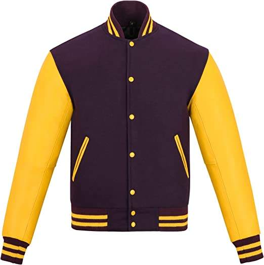 แจ็คเก็ตวาร์ซิตี้หนังผสมขนสัตว์คุณภาพพรีเมียมแบบยูนิเซ็กซ์ รุ่นปี 2025 ผลิตตามสั่ง สไตล์ลำลองสำหรับบาสเกตบอล เบสบอล มีตัวอักษร มีสีม่วงและสีทอง