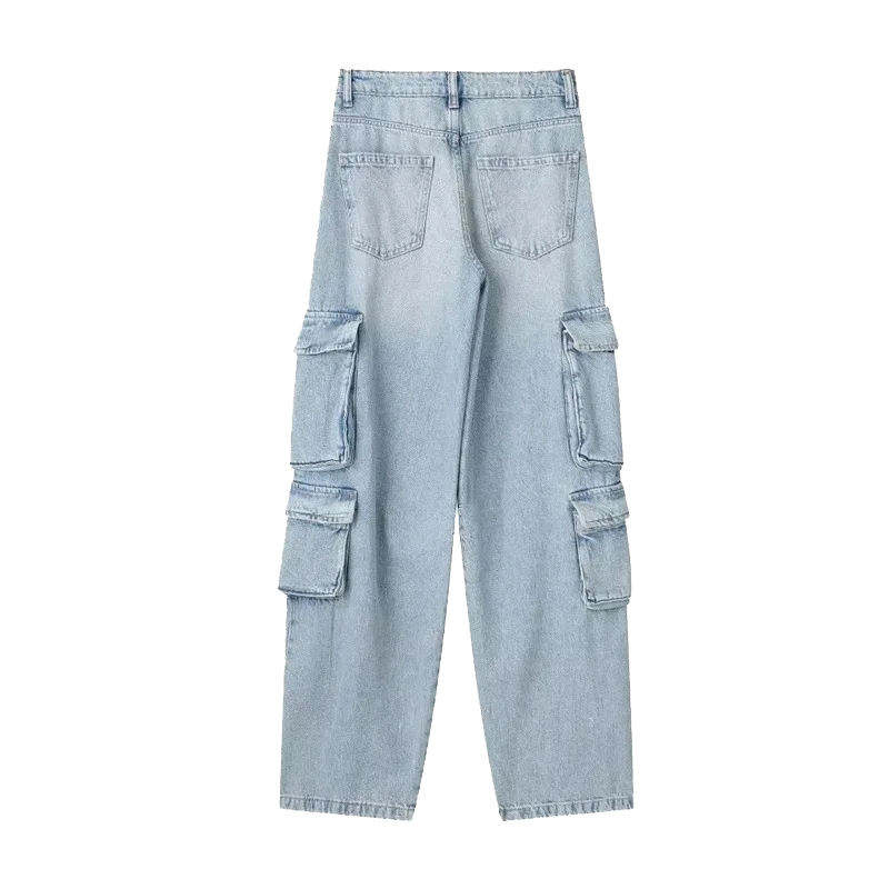 กางเกงยีนส์ขาตรงสำหรับผู้หญิงกางเกงยีนส์ขาตรงมีกระเป๋าหลายใบผ้า100% ซักด้วยทรายสไตล์สตรีทแบบใหม่2025 OEM