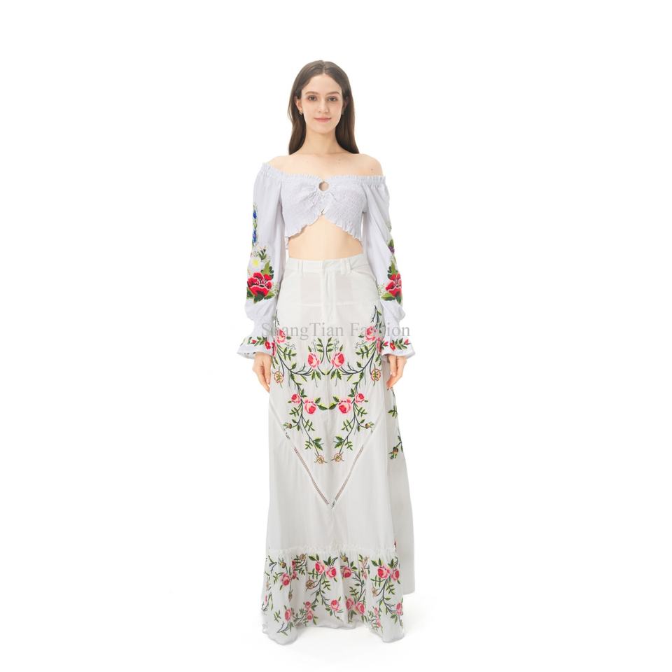 กระโปรงผู้หญิงแฟชั่นฤดูร้อนปี 2025 ลายดอกไม้ปักสดใส เอวสูง ราคาโรงงาน สีขาว