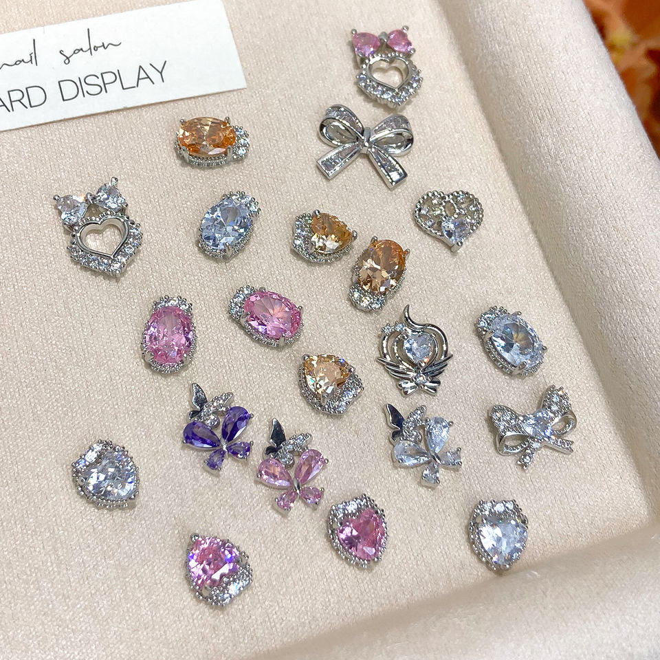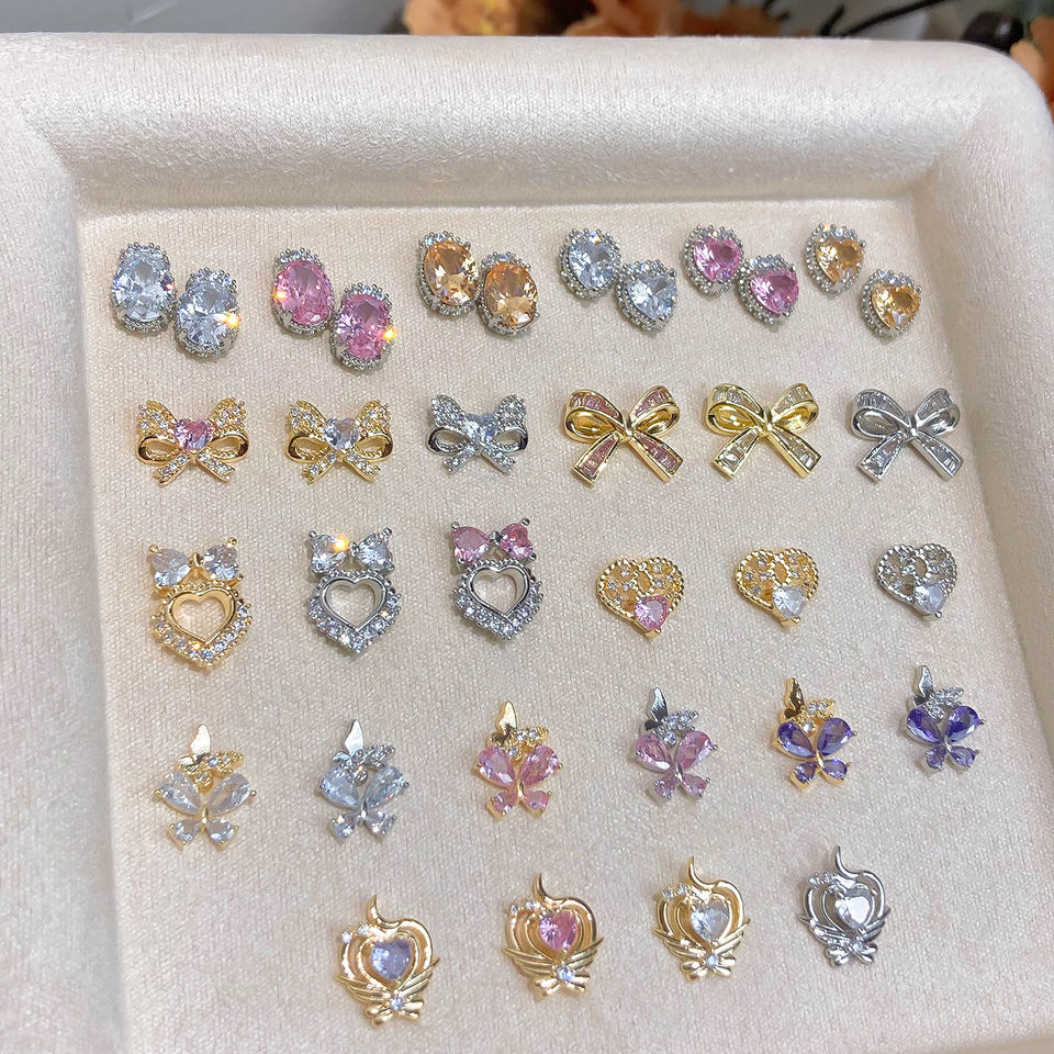เครื่องประดับเล็บวันวาเลนไทน์สีชมพูปี 2025 ชาร์มเล็บหรูหรา รูปหัวใจ ริบบิ้น เพชรซิร์คอน ของตกแต่งเล็บ 3 มิติ สำหรับร้านเสริมสวย