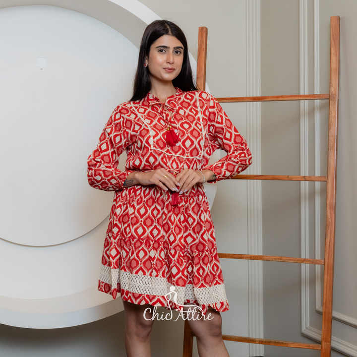ชุดเดรสสั้นผ้าฝ้ายทรงเอสำหรับผู้หญิงชุดเดรสสั้นสไตล์โบฮีเมียนแขนยาวพิมพ์ลาย Ikat สำหรับ2025