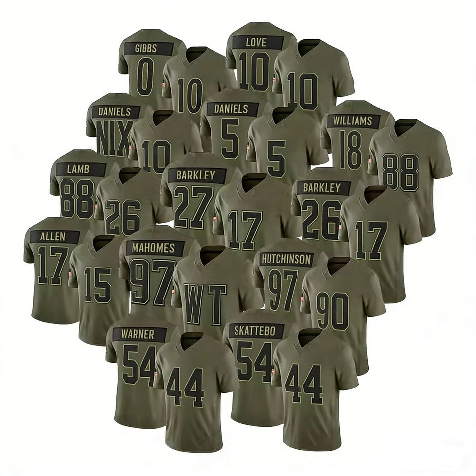 เสื้ออเมริกันฟุตบอลปักลาย 2025 Salute to Service หมายเลข 0 แจมีร์ กิ๊บส์ หมายเลข 90 ที.เจ. วอตต์ หมายเลข 18 คาเลบ วิลเลียมส์ หมายเลข 18 จัสติน เจฟฟอร์ด