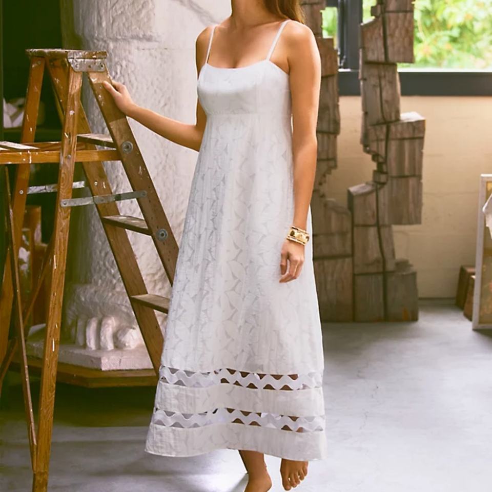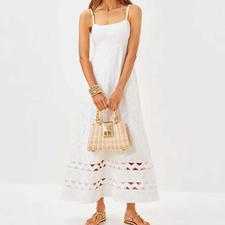 เดรสยาวสีขาวลายเรียบหรูหรา แขนกุด ผ้าเนื้อนุ่ม สำหรับสุภาพสตรี ปี 2025