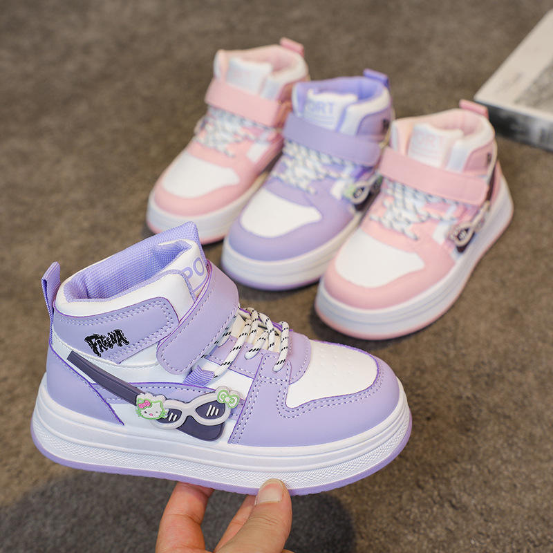 รองเท้าผ้าใบหุ้มข้อสูงสำหรับเด็กผู้หญิง ฤดูใบไม้ผลิ/ฤดูใบไม้ร่วง ปี 2025 ปิดด้วยเวลโคร หนังเทียม ลายการ์ตูน แฟชั่นใหม่ รองเท้ากีฬา
