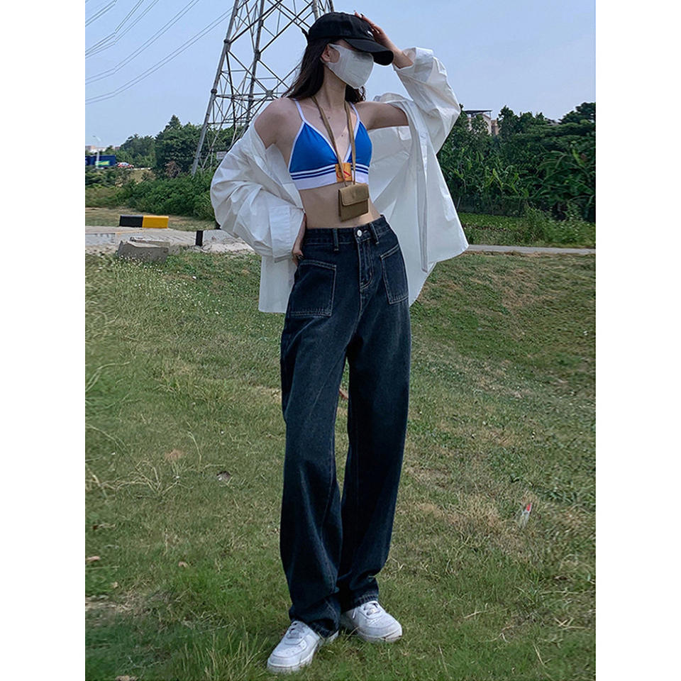 คอลเลกชันใหม่เข็มขัดรายละเอียดกางเกงยีนส์ขากว้างอิดโรย