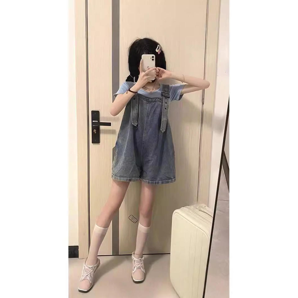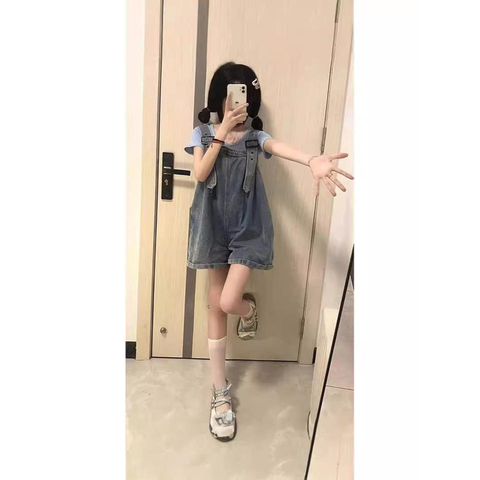 คอลเลคชั่นฤดูใบไม้ผลิฤดูร้อน2025ผ้าฝ้ายสีฟ้าอ่อนของผู้หญิงชุดเอี๊ยมยีนส์ลำลองแบบหลวมเทคนิคการซักสูง