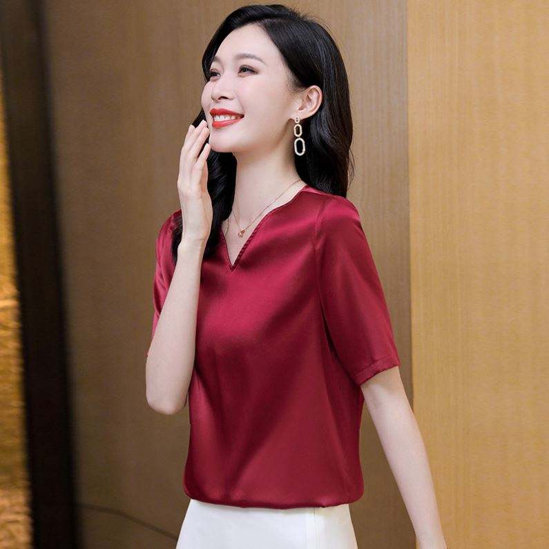 คอลเลคชั่นใหม่2025คอลเล็คชั่นเสื้อแขนสั้นผ้าไหมคอวีสำหรับผู้หญิงสีบริสุทธิ์แฟชั่นสไตล์เกาหลีทรงหลวม