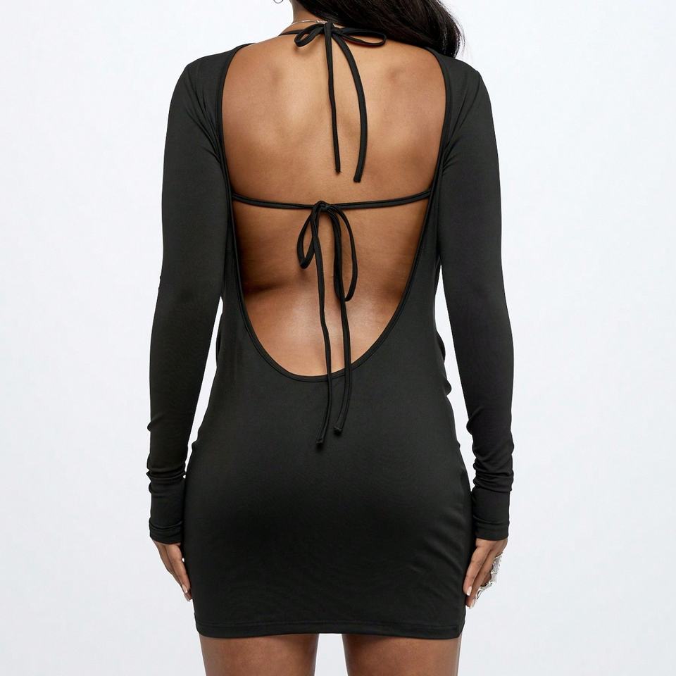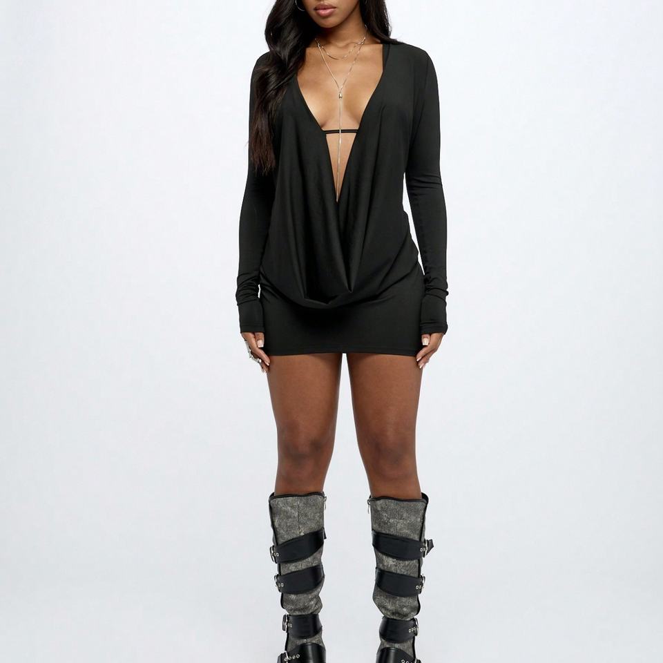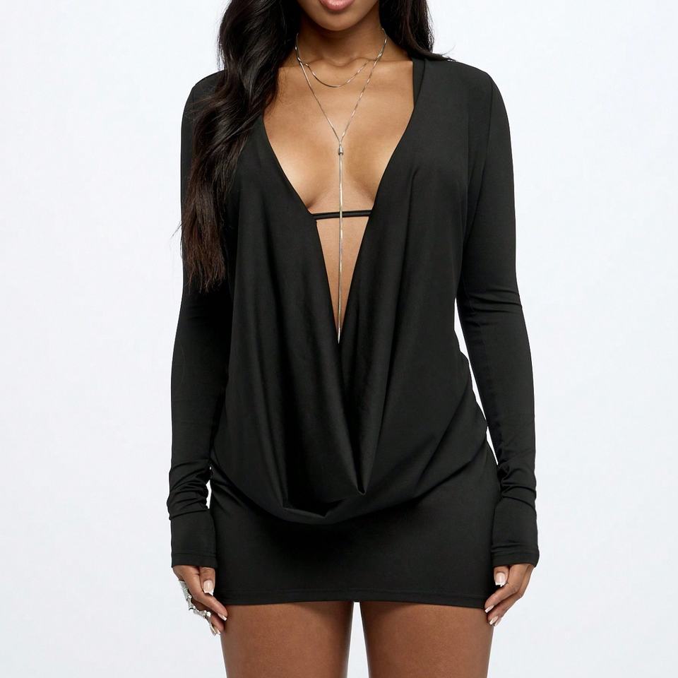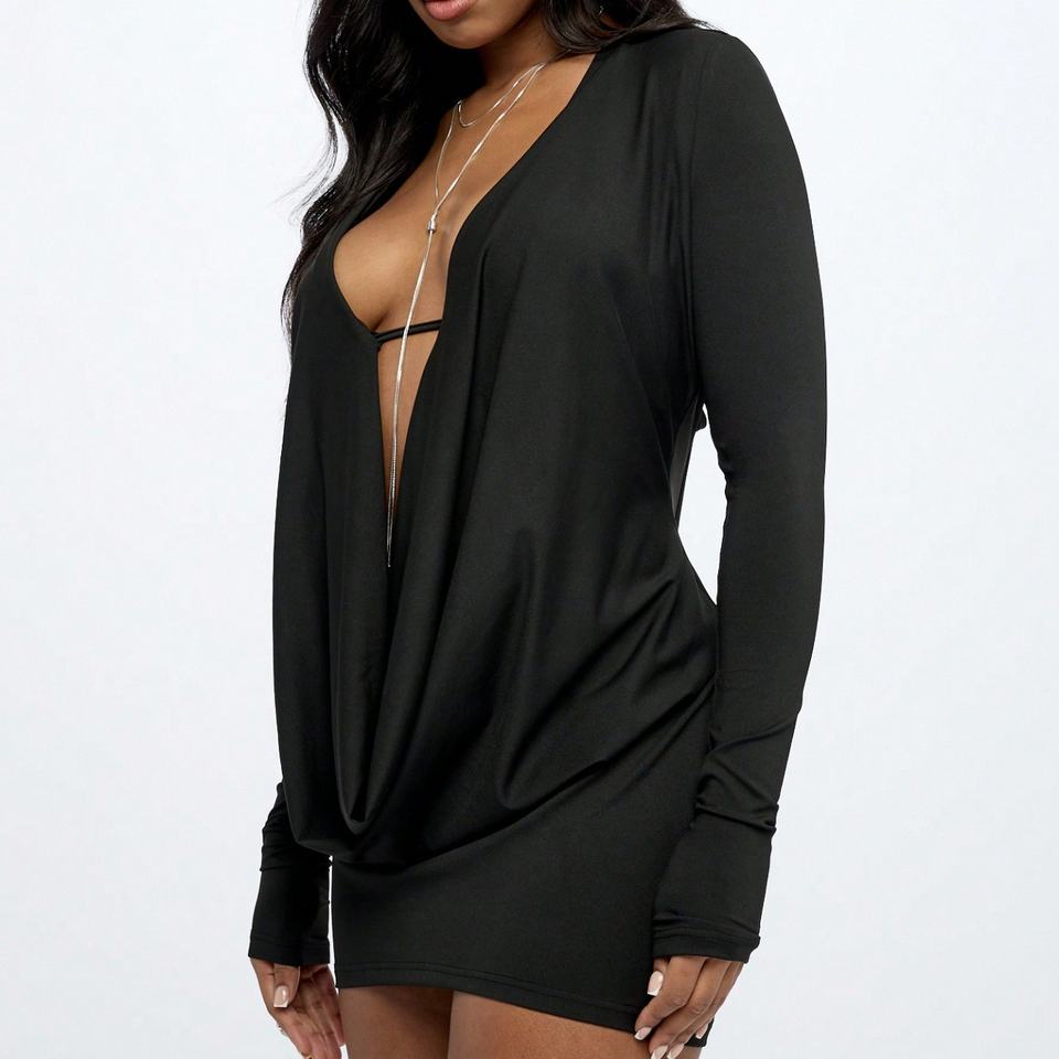 2025 Spring Summer Deep V-Neck Women Mini Dress Sexy Hipster Swing Collar Night Club Full Sleeve Skinny Rompers