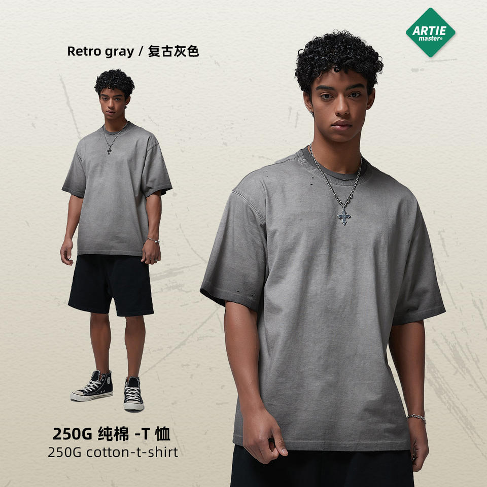 2025เสื้อยืดผู้ชายแบบย้อนยุคมีรูตัดขอบกระจายสีป้องกันการทอดสินค้าใหม่ฤดูใบไม้ผลิและฤดูร้อน