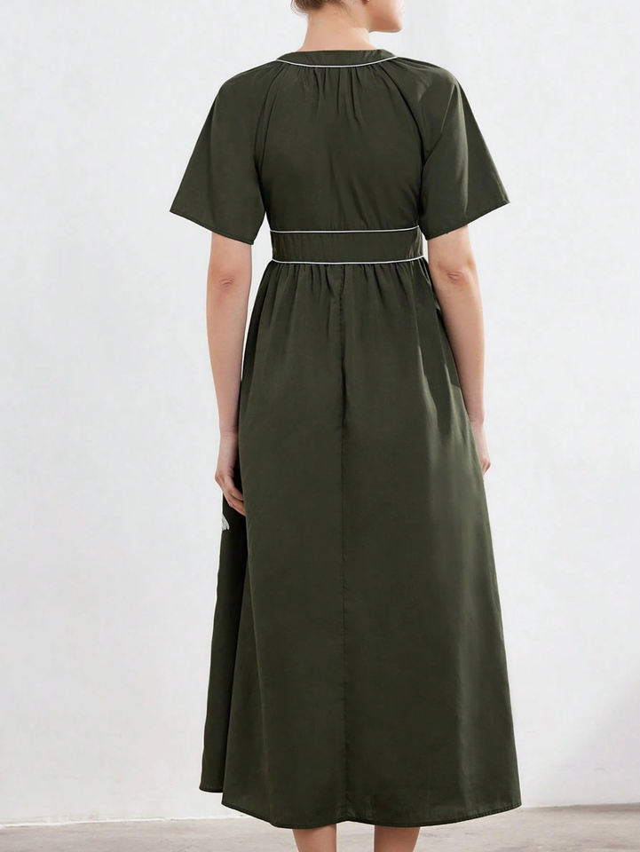 เดรสลำลองผู้หญิงสีเขียวเข้ม แขนสั้น ปักลายหรูหรา ทรงเอวธรรมชาติ ผ้าฝ้ายทอ 100% สำหรับฤดูร้อน ปี 2025