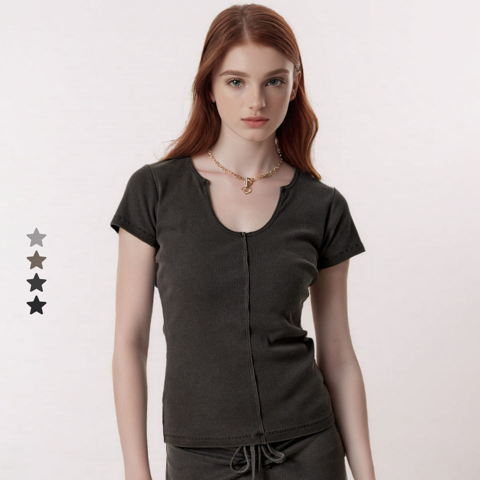 เสื้อยืดแขนสั้นเข้ารูปคอวีลึกสไตล์ยุโรป-อเมริกันย้อมสีล้วนๆเผ็ดร้อน2025ฤดูร้อน