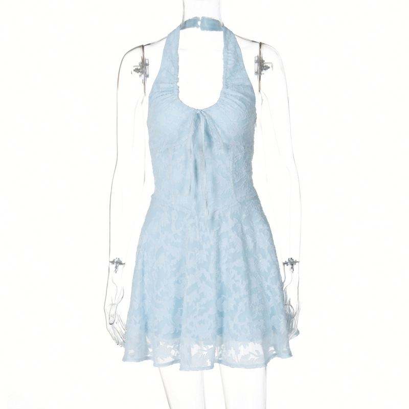 เดรสผ้าแจ็คการ์ดเปิดหลังสายคล้องคอเซ็กซี่เอวสูงสำหรับผู้หญิงเดรสผ้าแจ็คการ์ดสไตล์ยุโรปอเมริกันฤดูร้อนของ2025