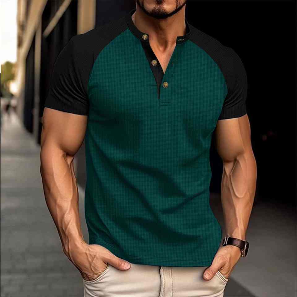 เสื้อยืดแขนสั้นคอตตอนสำหรับผู้ชายเสื้อ100% ไขว้คอวาฟเฟิลสำหรับฤดูร้อน2025