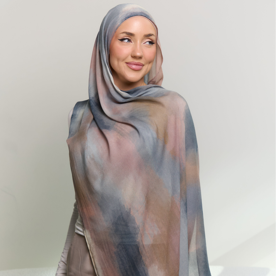 ผ้าคลุมศีรษะฮิญาบพิมพ์ลายดอกไม้แบบไล่ระดับสีหมึกมัดย้อมดิจิทัลสำหรับชาวมุสลิม2025ฤดูร้อน