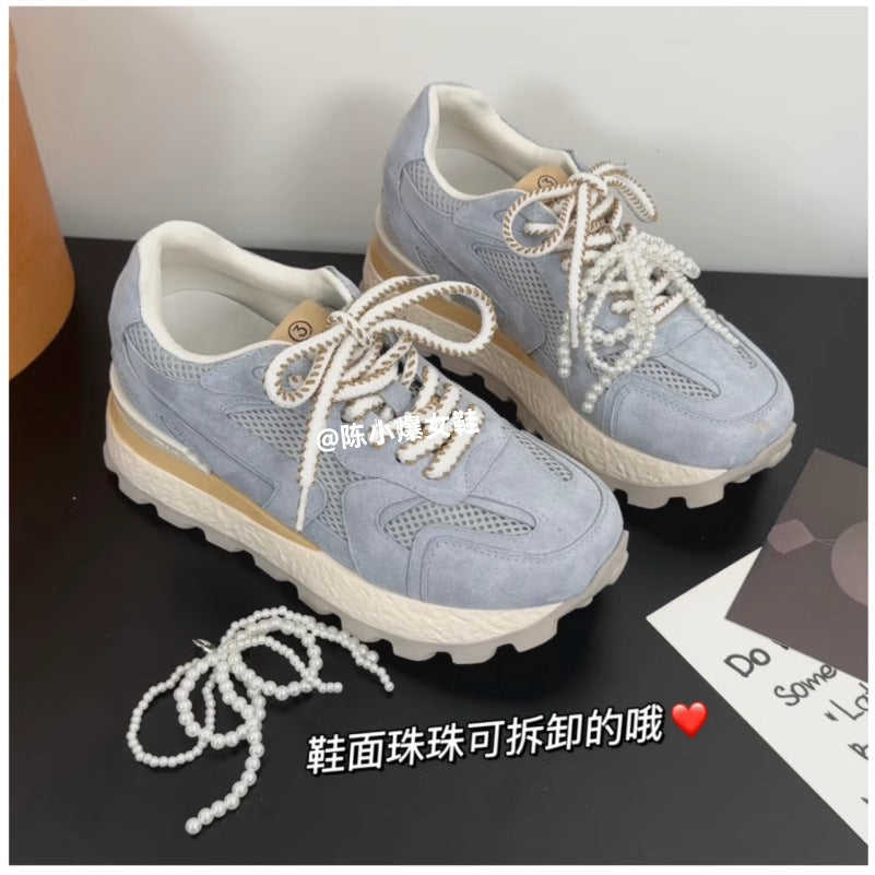 รองเท้าวิ่งผู้หญิงสไตล์ใหม่ประจำฤดูร้อนปี 2025 หนังแท้ ระบายอากาศดี พื้นรองเท้าเสริมส้นสูง 8 ซม. แบบลำลองสำหรับเล่นกีฬา