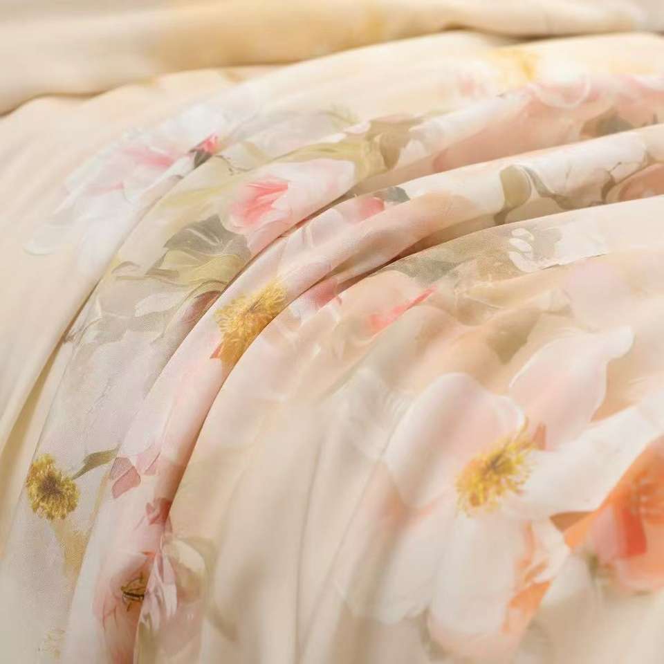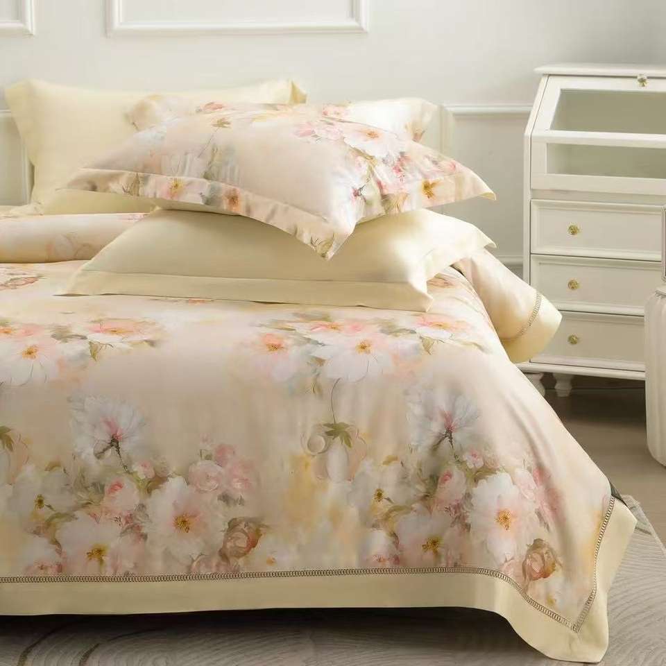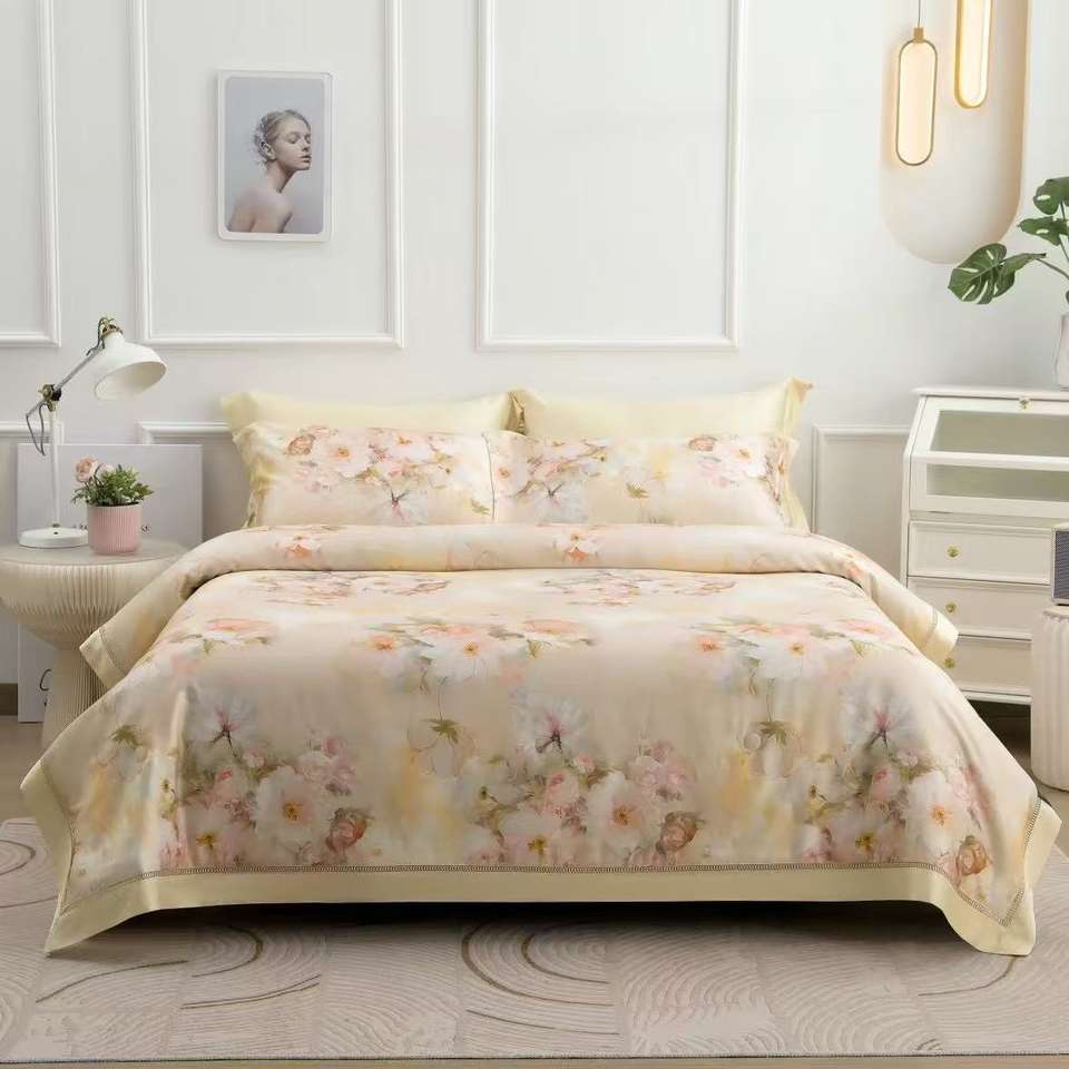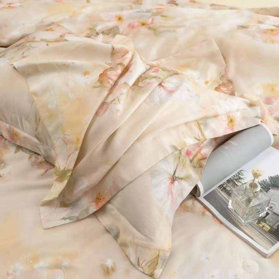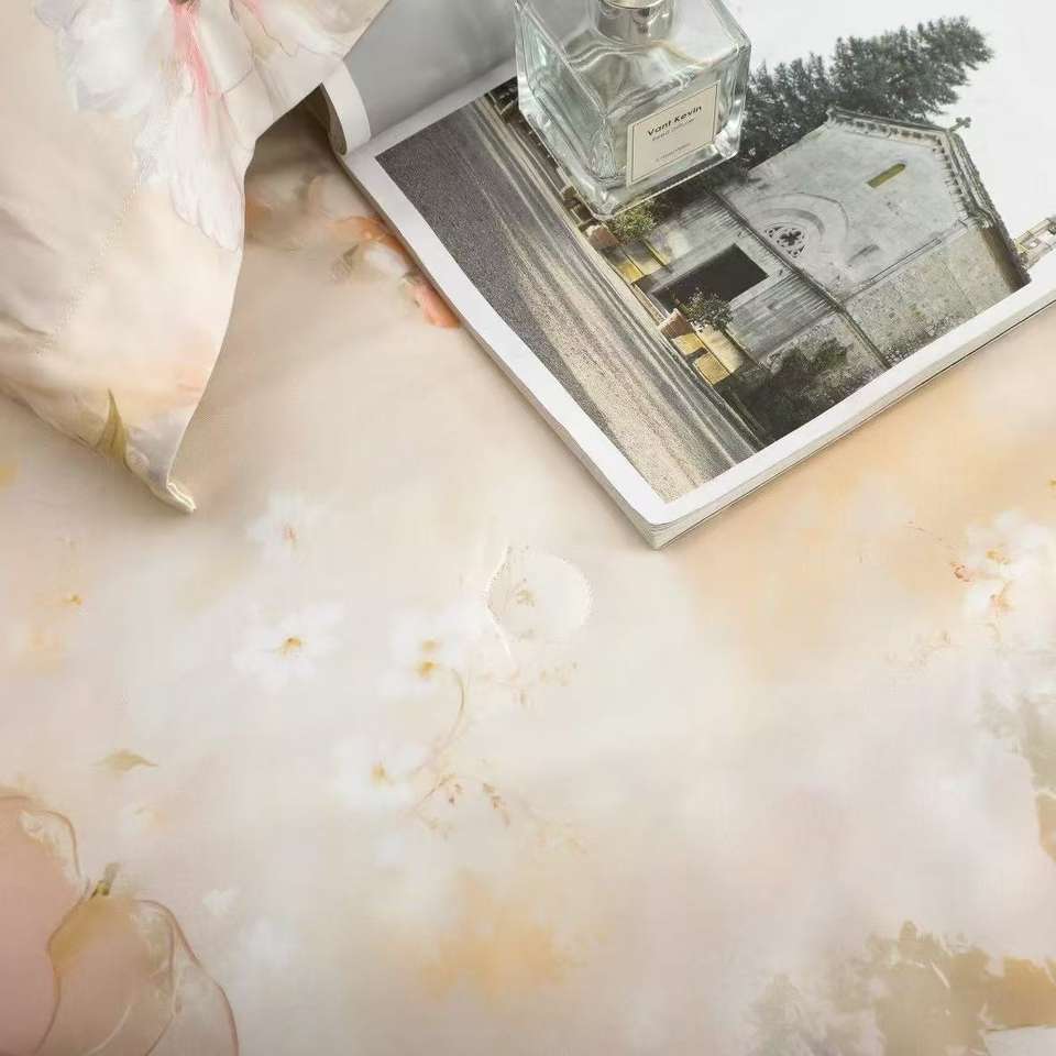 ชุดเครื่องนอนผ้าปูที่นอนและผ้านวมลายพิมพ์หรูหราสำหรับฤดูร้อนปี 2025 ผลิตจากผ้าผสมโพลีเอสเตอร์/คอตตอน เป็นมิตรกับสิ่งแวดล้อม