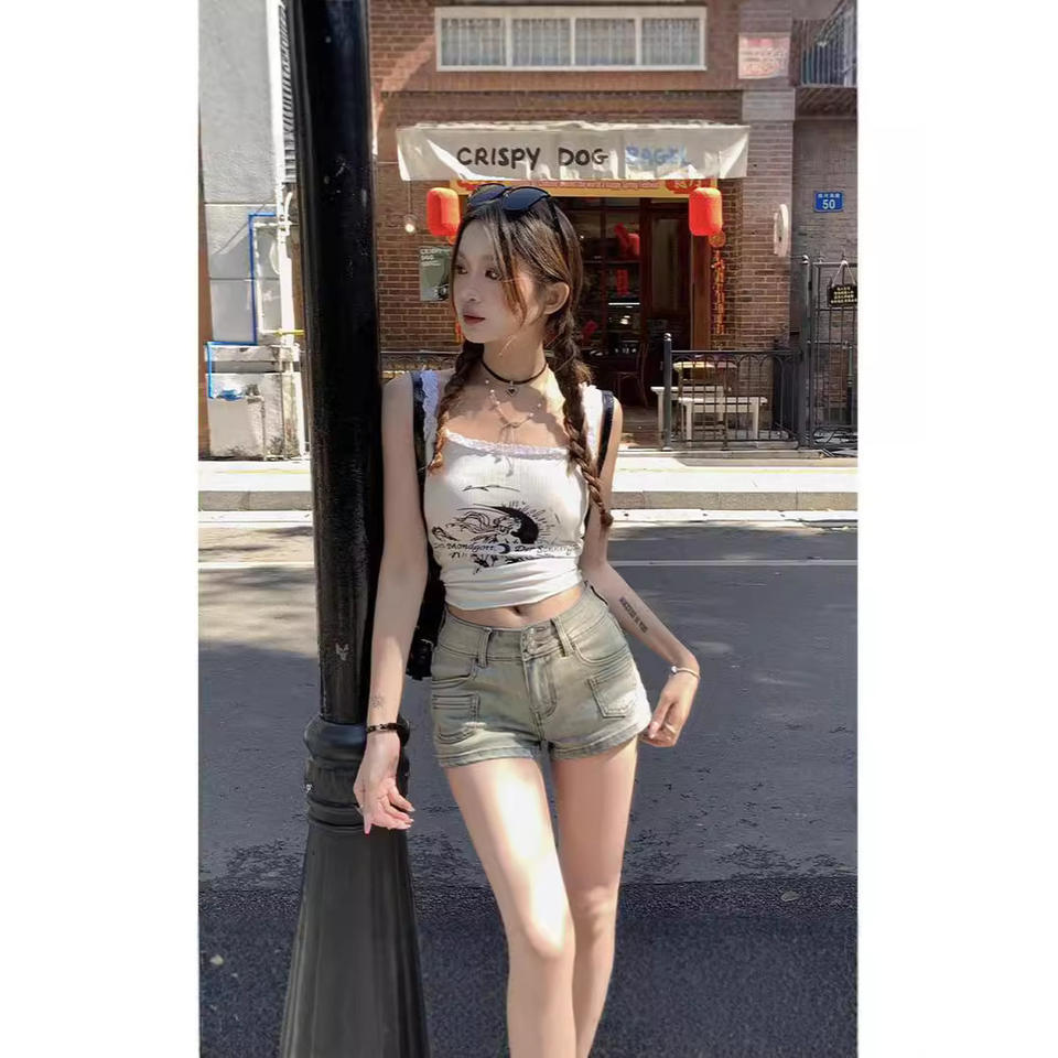 กางเกงขาสั้นผ้ายีนส์กระดุมสองเม็ดสำหรับผู้หญิงกางเกงยีนส์ทรงตรงเอวสูงสไตล์อเมริกันย้อนยุคฤดูร้อน2025