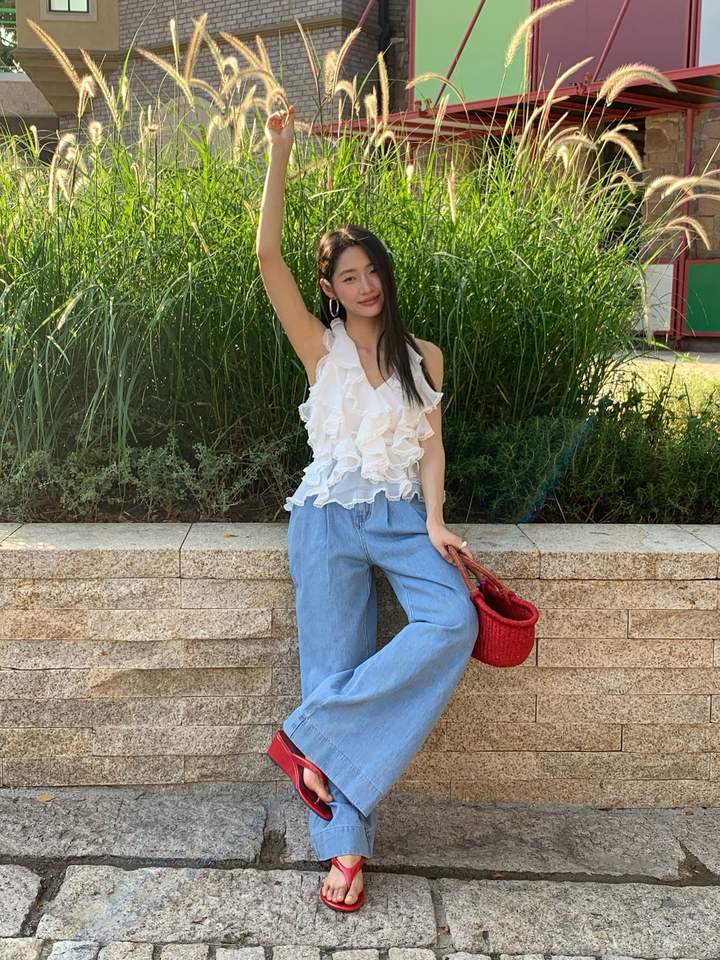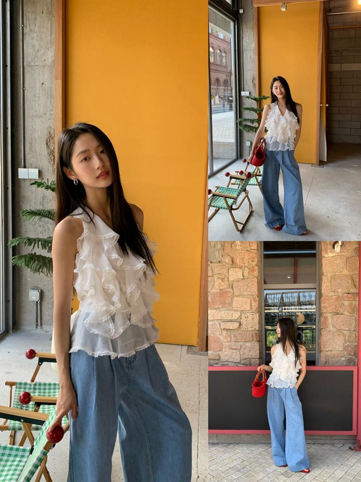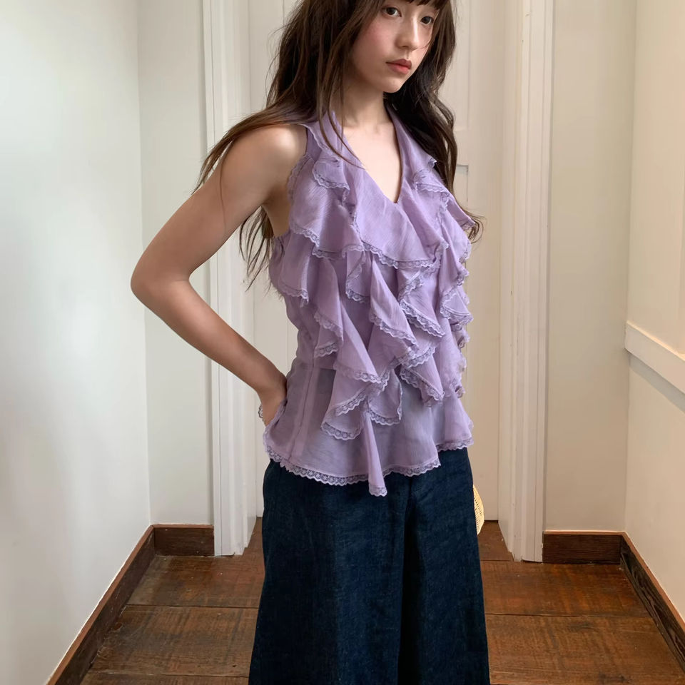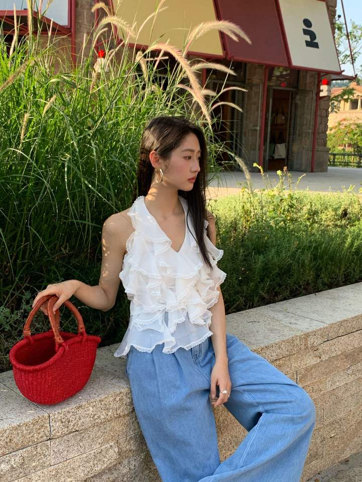 เสื้อชีฟองลายนูนสไตล์หวานซ่อนเปรี้ยวลำลอง ระบายอากาศได้ดี ดีไซน์คอตั้งเปิดหลัง เซ็กซี่ ลายเรขาคณิต ไซส์พลัส สำหรับฤดูร้อนปี 2025