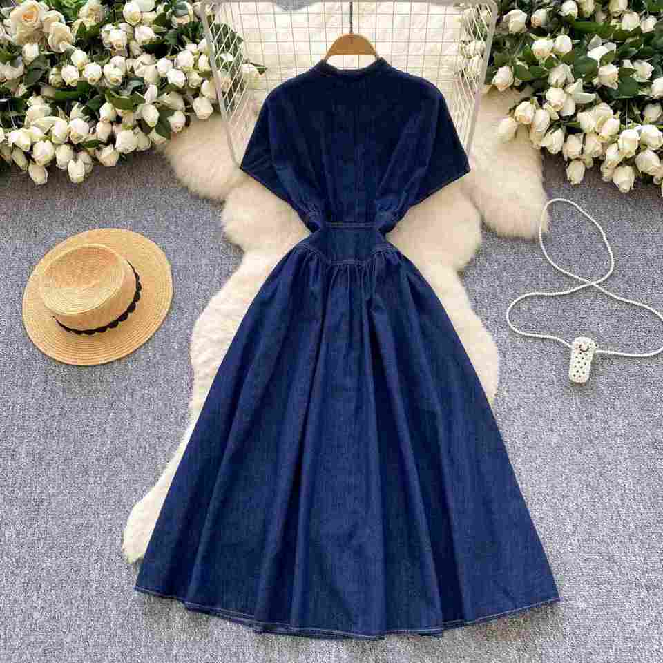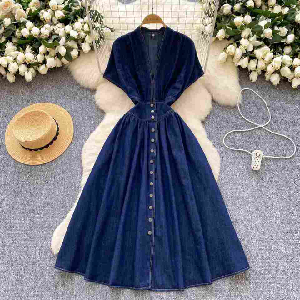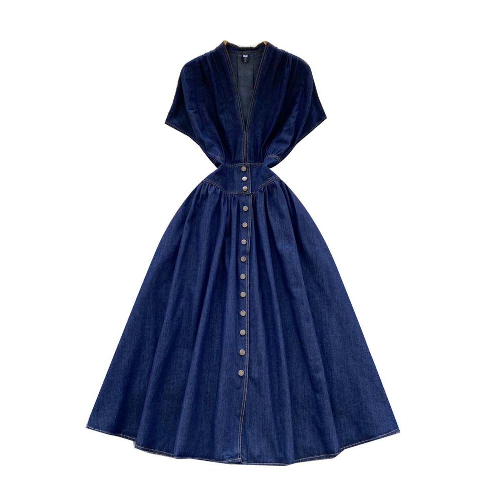 2025 Summer Casual Slim-Fit V-Neck Woven Denim Digital Printing Pleated Midi Bodycon Dress for Women Empire Waist
