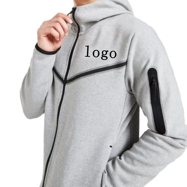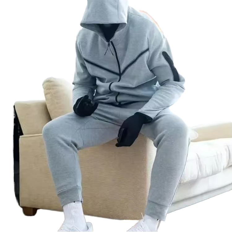 ชุดกีฬาผู้ชายสีเทาแบบสองชิ้น รุ่น Tech Fleech ปี 2025 ผ้าซาติน สำหรับวิ่งจ๊อกกิ้ง พร้อมโลโก้สั่งทำด้านหน้า ชุดลำลองแบบสวมใส่สบาย ผ้าถัก แห้งเร็ว ไร้ตะเข็บ