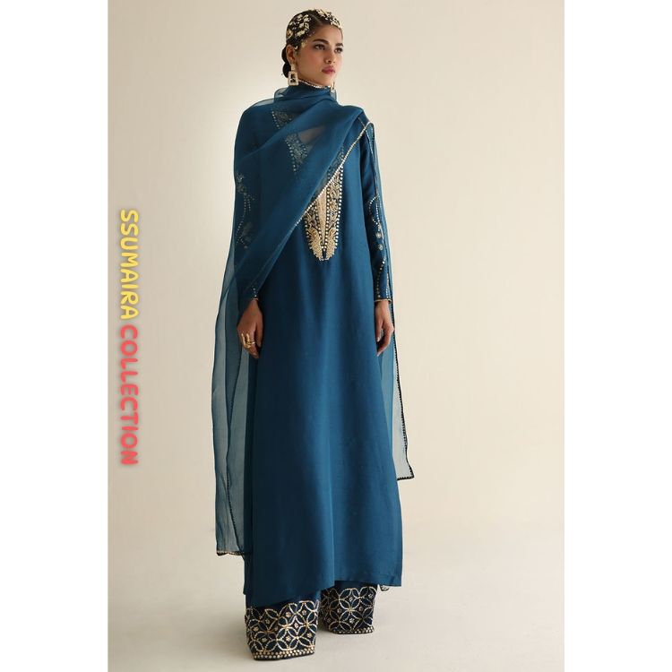 เทรนด์ปี 2025 เสื้อเชิ้ตยาวทรงตรงผ้าออร์แกนซ่าสีฟ้าอมเขียว พร้อมผ้าคลุมไหล่ ชุดสไตล์ทางการ ปักคริสตัลและหินตกแต่ง แห้งเร็ว