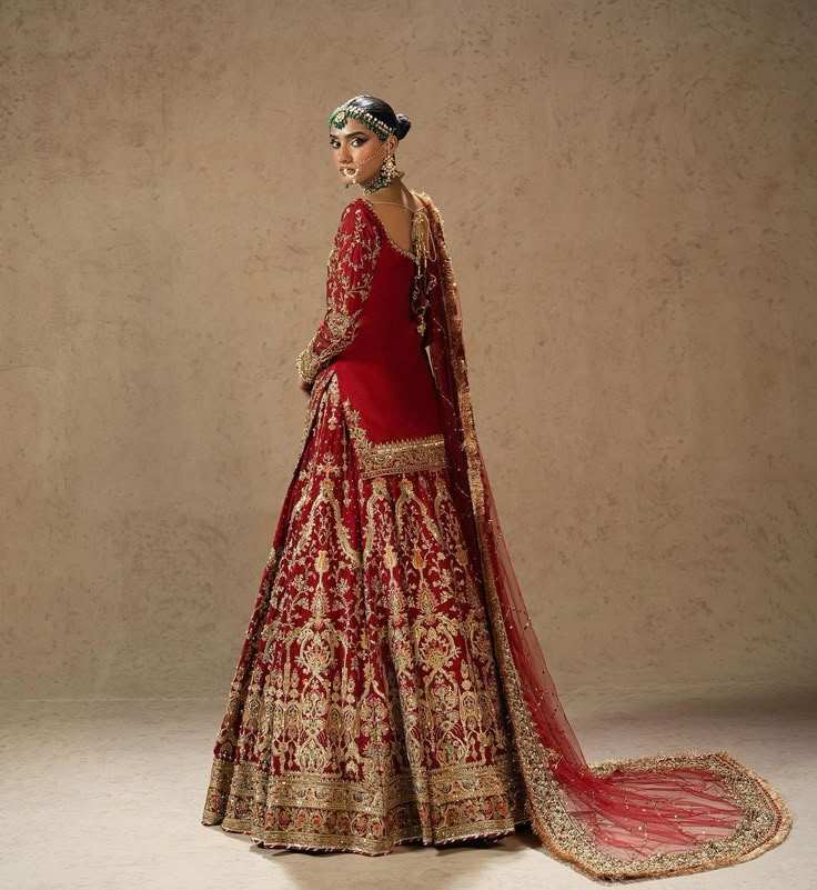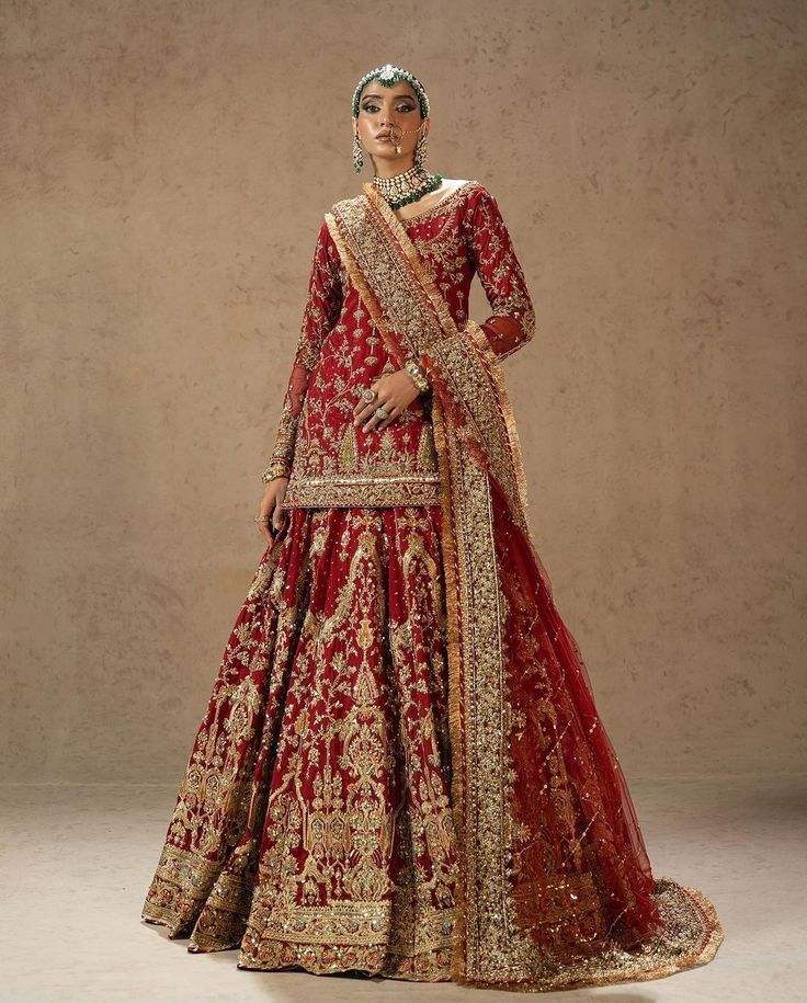 Kurta เดรส lehenga & dupatta ประดับด้วยไข่มุกปักหิน zari สีแดงดีไซน์เนอร์2025 @ อินเทรนด์