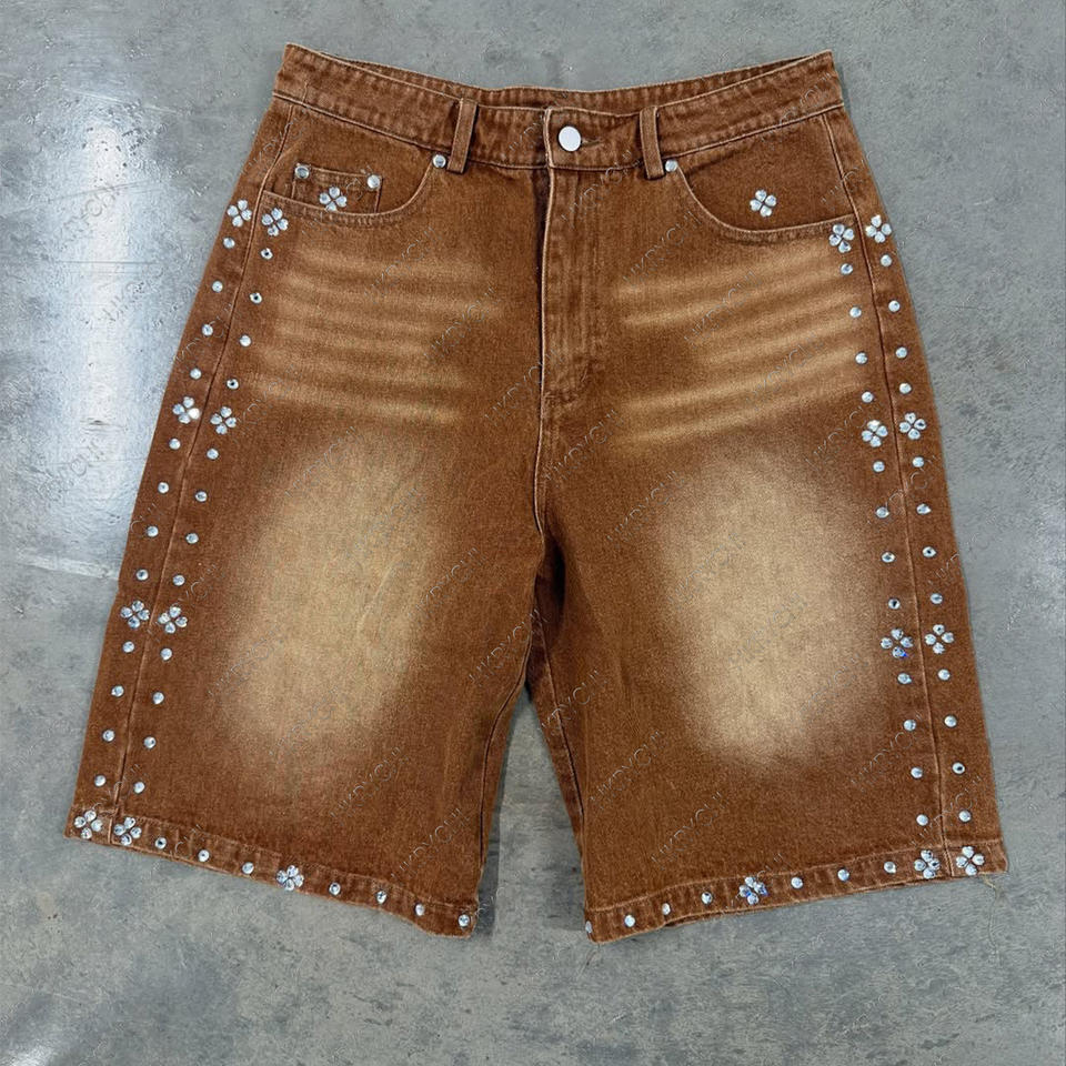 กางเกงยีนส์ขาสั้นทรงหลวมสไตล์เทรนดี้ปี 2025 สำหรับผู้ชาย สวมใส่สบายในฤดูร้อน แต่งคริสตัลและเพชรเทียม ทรงแบ็กกี้