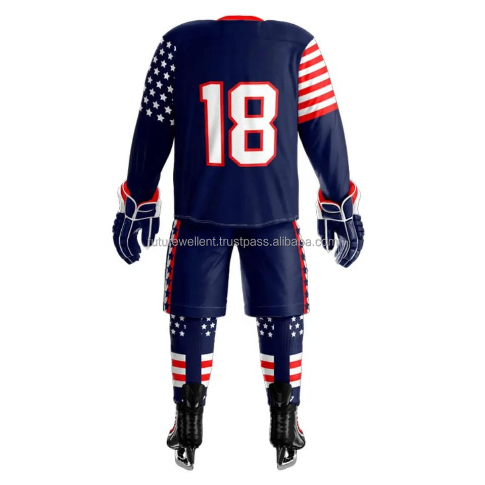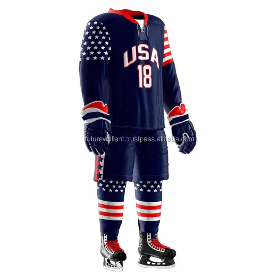 2025ใส่ได้ทั้งชายและหญิงชุดยูนิฟอร์มฮ็อกกี้น้ำแข็ง OEM ชุดเล่นกีฬาดีไซน์ใหม่ชุดเจอร์ซีย์และกางเกง