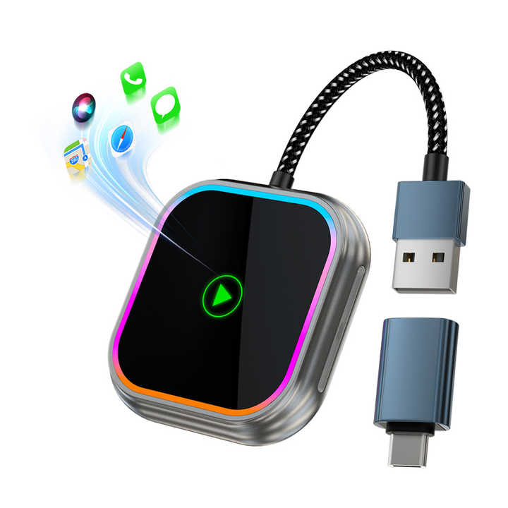 อะแดปเตอร์ CarPlay แบบไร้สายสำหรับ Apple iPhone รถยนต์พร้อมสายชาร์จ USB ไฟ RGB อัพเกรด2025
