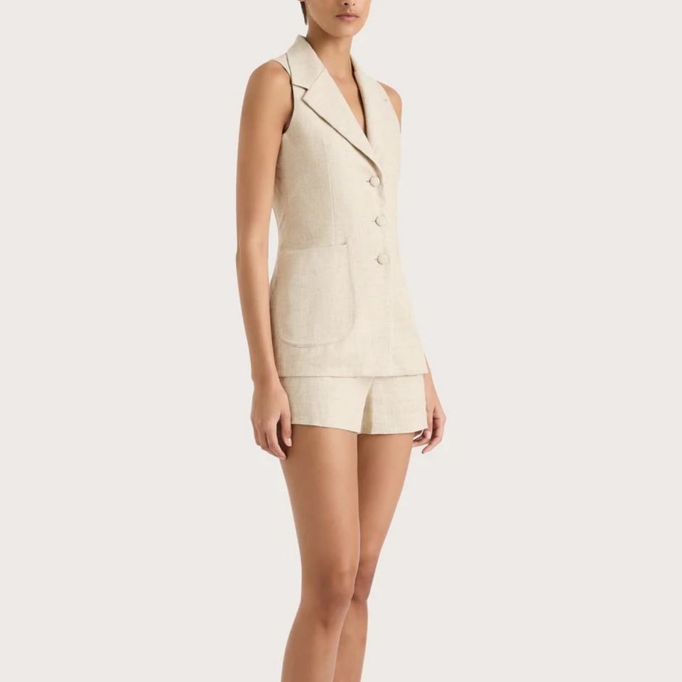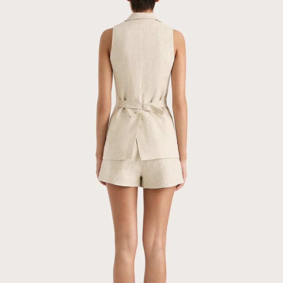 ชุดสูทลำลองผ้าลินินแบบสวมใส่สบายสำหรับเดินทาง ปี 2025 เสื้อกั๊กแขนกุด กางเกงขาสั้น แฟชั่นฤดูร้อน ชุดสองชิ้นสีพื้นสำหรับผู้หญิง