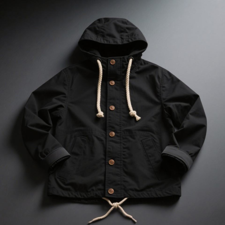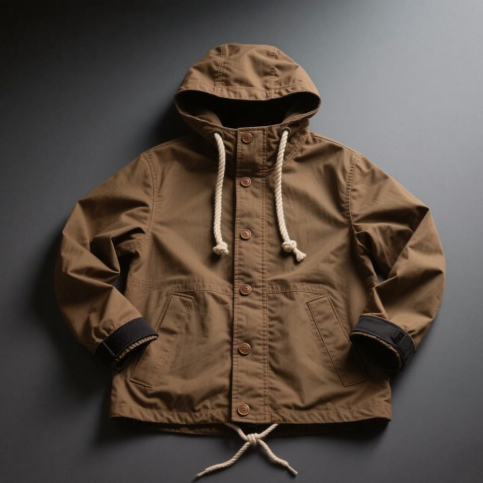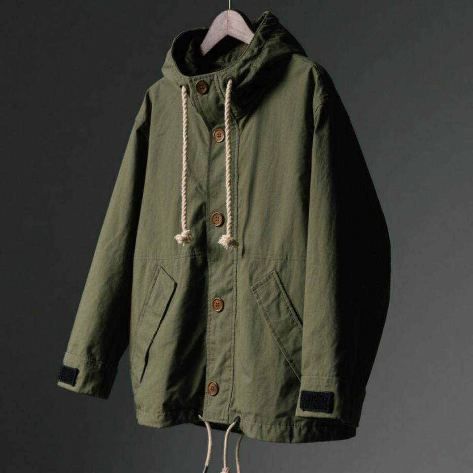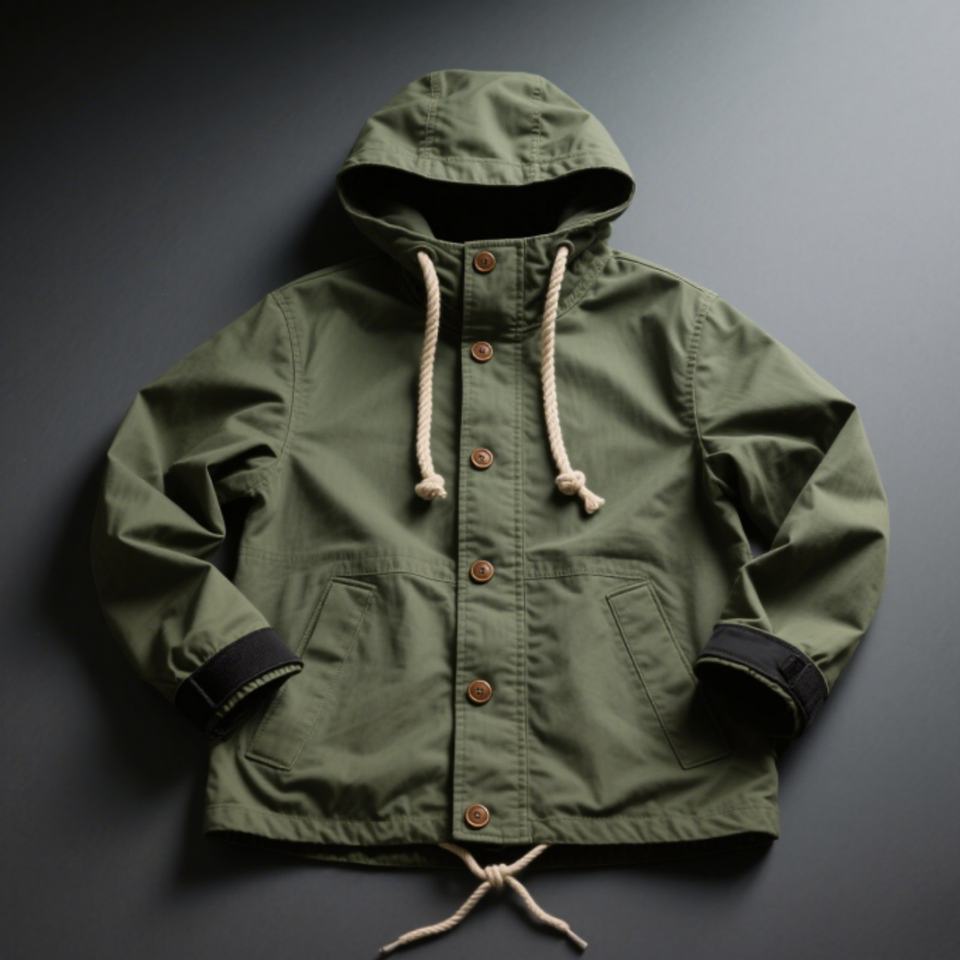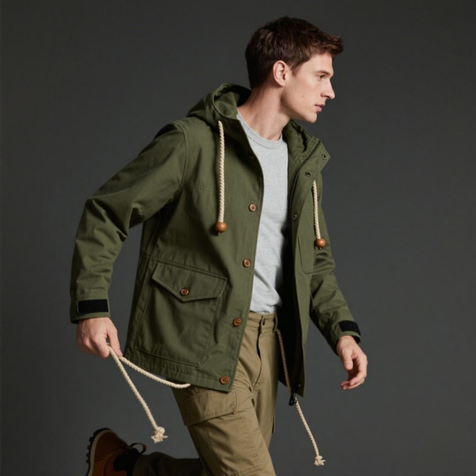 เสื้อแจ็คเก็ตกันลมผู้ชายสีเขียวแบบมีฮู้ด ปี 2025 ขายส่ง คอตั้ง ใส่ได้ทุกสภาพอากาศ ปรับได้ กระดุมสีเข้ม พร้อมกระเป๋าอเนกประสงค์