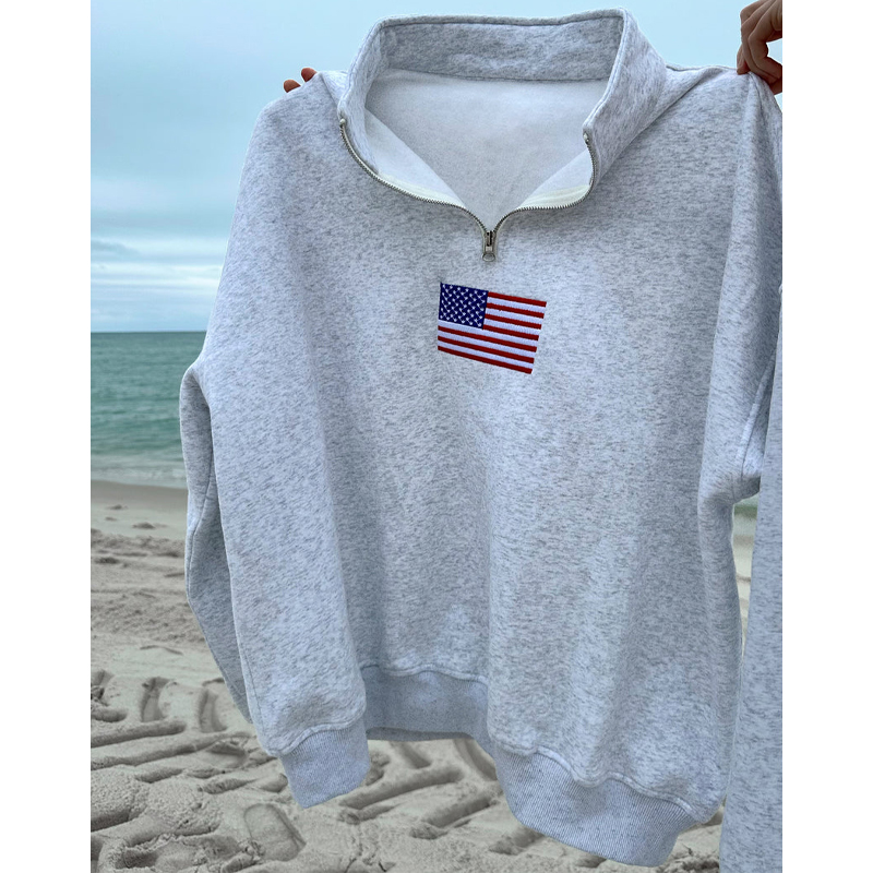 2025 Winter Embroidered American Flag Gray 1/4 Zip Stand Collar Front Logo Sweatshirt Pullover Zipper for Women