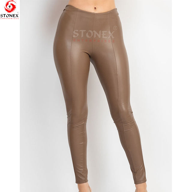 กางเกงหนังเอวสูงสำหรับผู้หญิงกางเกงขากว้างยืดได้กางเกงหนังวีแกน2025