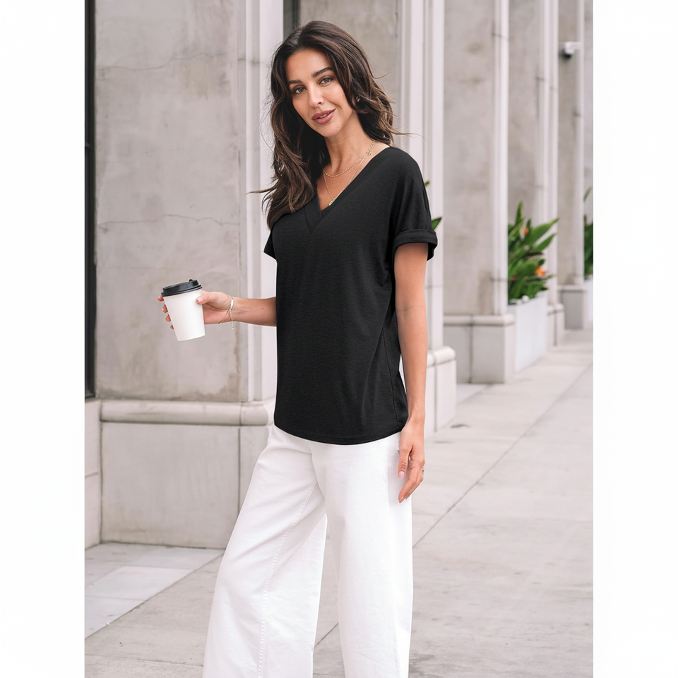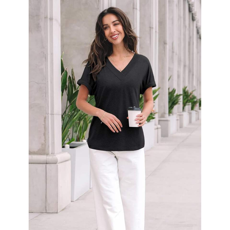 2025เสื้อยืดแขนสั้นคอวีแนวอินเทรนด์สำหรับผู้หญิง2025เรียบง่ายน่ารักสไตล์เพรียวบางสำหรับฤดูใบไม้ผลิเสื้อท่อนบนระบายอากาศได้ดีสำหรับฤดูร้อน