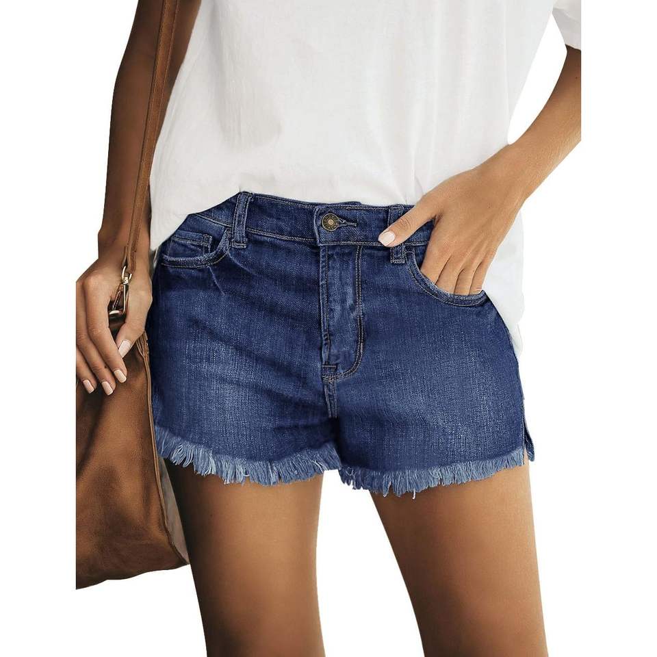 กางเกงขาสั้นผ้ายีนส์เอวสูงปานกลางแบบลำลองของผู้หญิง2025กางเกงขาสั้นผ้ายีนส์ผ้ายืดมีกระดุมขาดชายเสื้อตรง