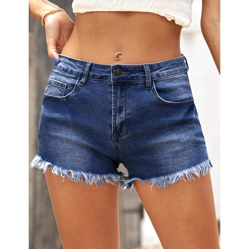 กางเกงขาสั้นผ้ายีนส์เอวสูงปานกลางแบบลำลองของผู้หญิง2025กางเกงขาสั้นผ้ายีนส์ผ้ายืดมีกระดุมขาดชายเสื้อตรง