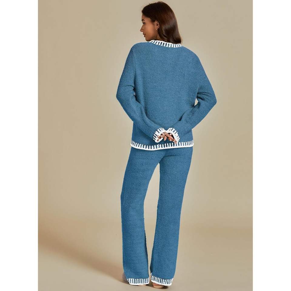 2025ชุดนอนลำลองกันหนาวสำหรับผู้หญิง, เสื้อสเวตเตอร์ถักแขนยาวผ้าฟัซซี่กันหนาวแต่งขอบสีตัดกัน