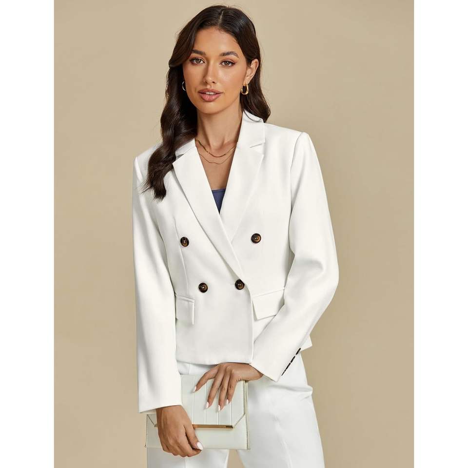 เสื้อสูททำงานสำนักงานแขนยาวมีปกและกระดุมสองแถวสำหรับผู้หญิงเสื้อแจ็กเก็ตสูทธุรกิจลำลองสีพื้นสำหรับ2025