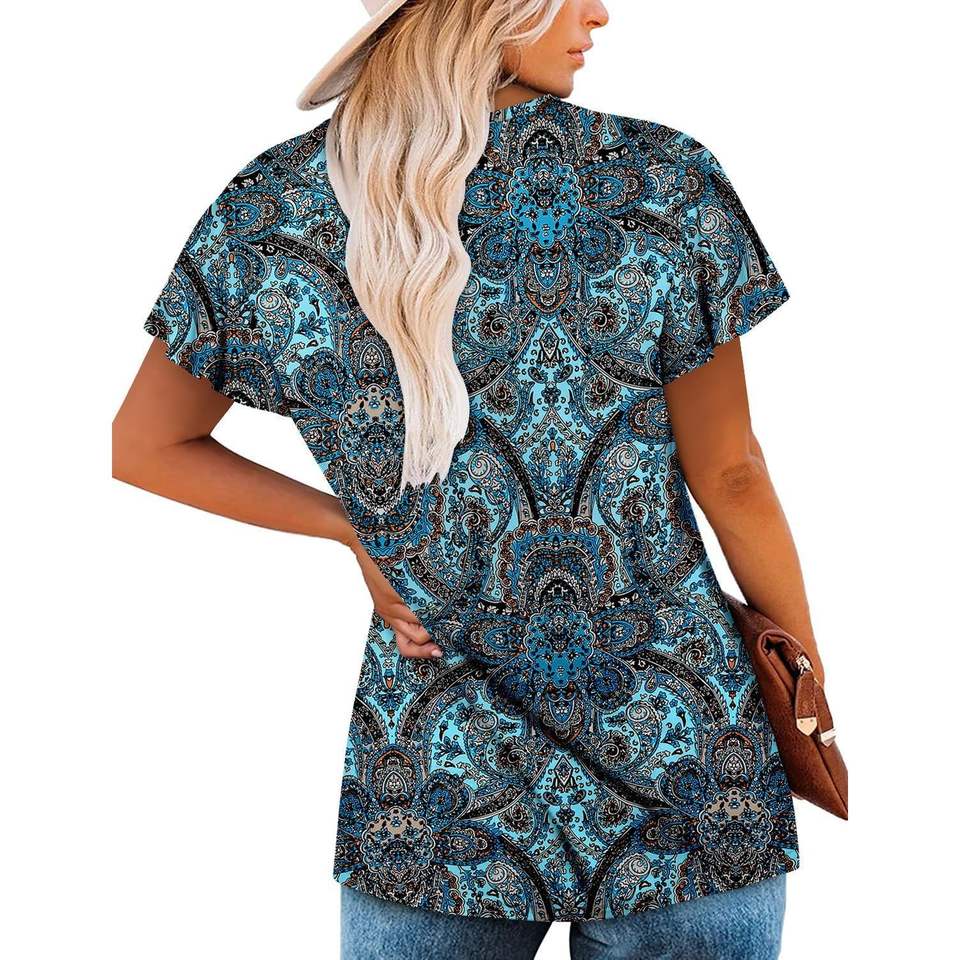 2025เสื้อโบฮีเมียนพลิ้วไหวคอวีสำหรับผู้หญิงเสื้อฤดูร้อนแขนสั้นเสื้อคลุมสีฟ้าซ่อนพุงขนาด XL