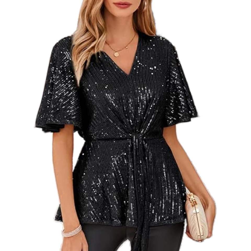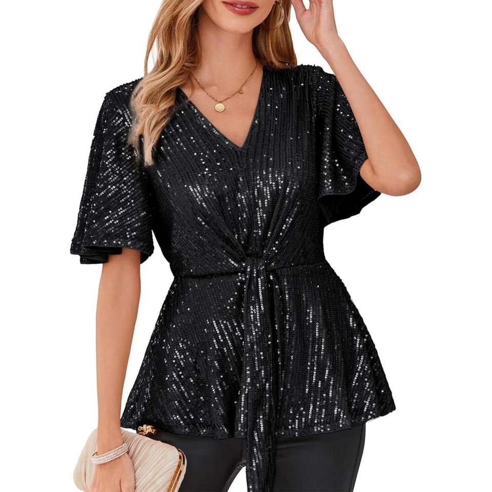 2025เสื้อเบลาส์แวววาววิบวับคอวีปักเลื่อมแวววาวสำหรับผู้หญิงเสื้อปาร์ตี้แขนกระดิ่งสั้นผูกด้านหน้า