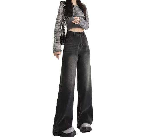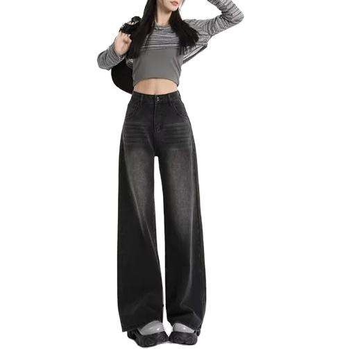 2025กางเกงขาตรงเอวสูงแบบอเมริกันมีจีบ XL กางเกงยีนส์ซักได้ทุกฤดูกาลสไตล์สตรีท