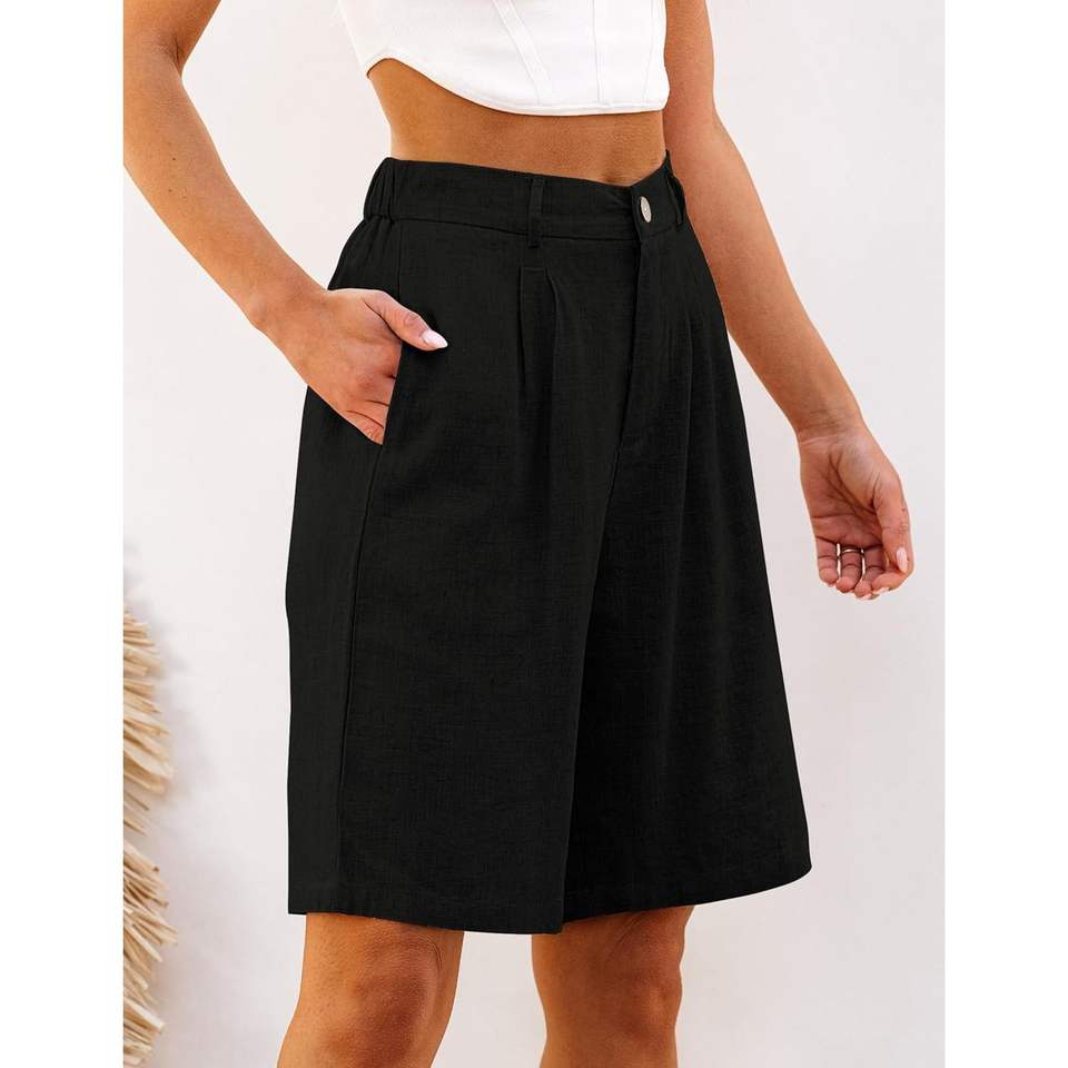 2025กางเกงขาสั้นเอวสูงผ้าลินินเอวสูงสำหรับผู้หญิงขาสั้นทรงเบอร์มิวดาแบบลำลองมีจีบฤดูร้อนมีลายเอวยางยืด