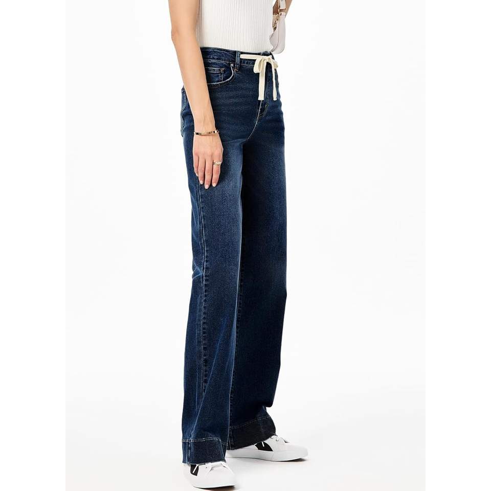 2025กางเกงยีนส์เอวสูงขากระบอกขาตรงมีเชือกรูด, กางเกงยีนส์ผ้ายืด zimbaplatinum ระบายอากาศได้ดีมีขาบานกว้าง