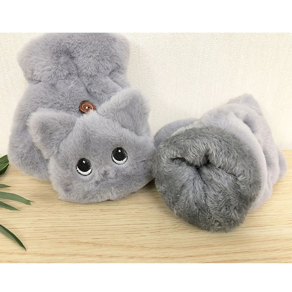ถุงมือผ้ากำมะหยี่อบอุ่นสำหรับผู้หญิง, ถุงมือผ้ากำมะหยี่อบอุ่นผ้าโพลีเอสเตอร์ใส่ปั่นจักรยานในฤดูหนาวดีไซน์รูปกระต่ายแมวและถุงมือพับครึ่งนิ้ว
