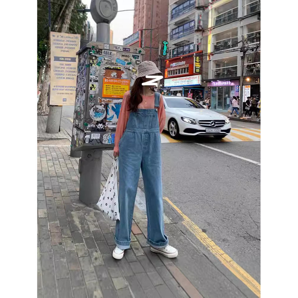 ชุดจั๊มสูทสไตล์เกาหลีย้อนยุคฮิโรมิสีน้ำเงินเข้มของผู้หญิง2025ชุดเอี๊ยมยีนส์ทรงหลวมขากว้างเอวสูงกระเป๋าใหญ่ทรงหลวม