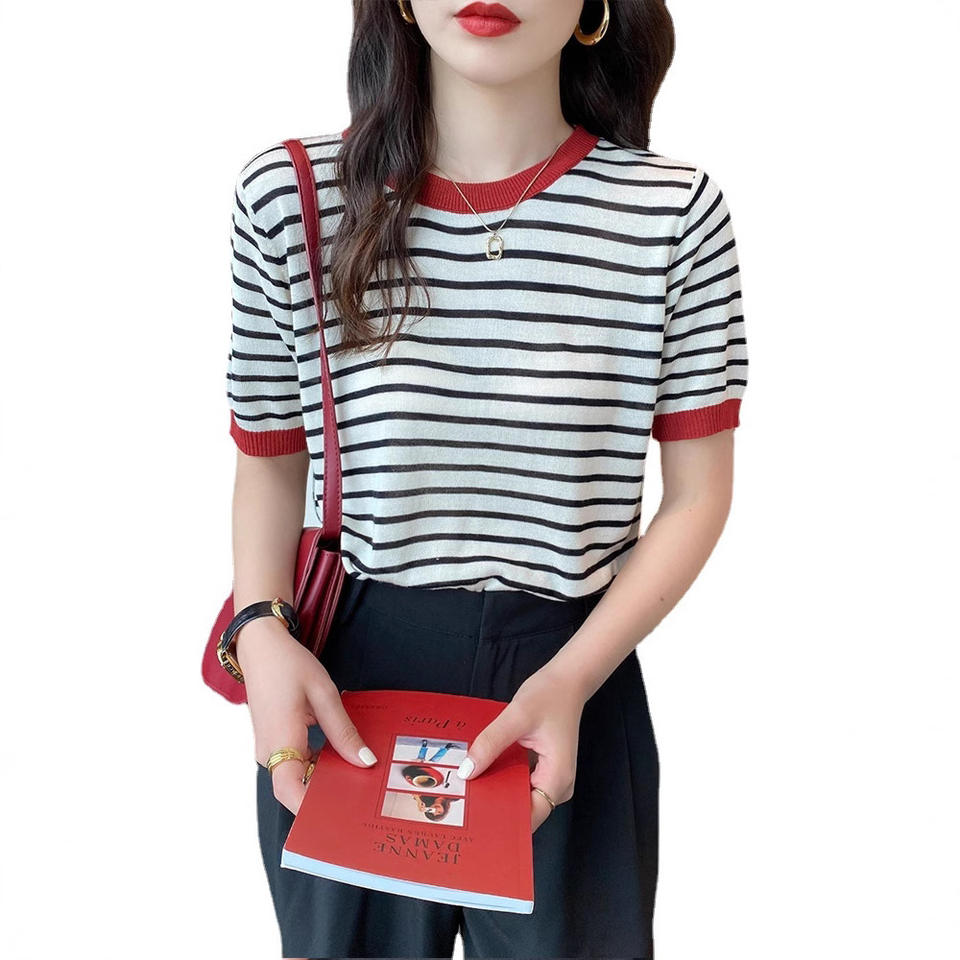 2025เสื้อลายทางของผู้หญิงเสื้อยืดถักพิมพ์ลายคอเสื้อแขนสั้นลำลองผ้าทอแบบเรียบง่ายกันลื่นอัดแน่นสำหรับฤดูร้อน