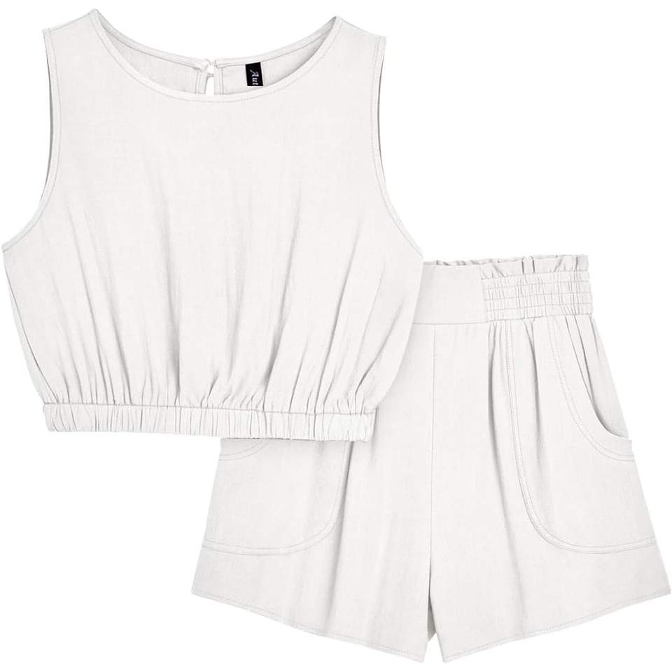 2025ฤดูร้อนของผู้หญิงชุด2ชิ้นเสื้อกล้ามครอปคอกลมแขนกุดมีกระเป๋าเอวสูงกางเกงขาสั้นมีขนาด XXL