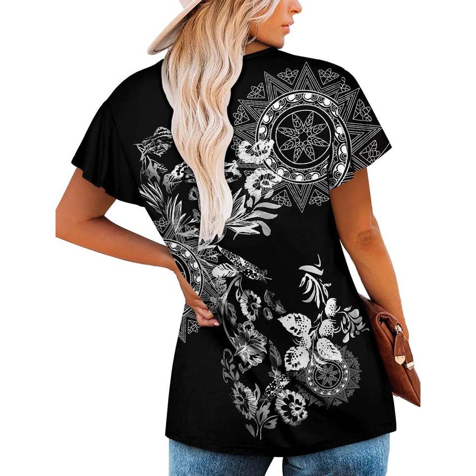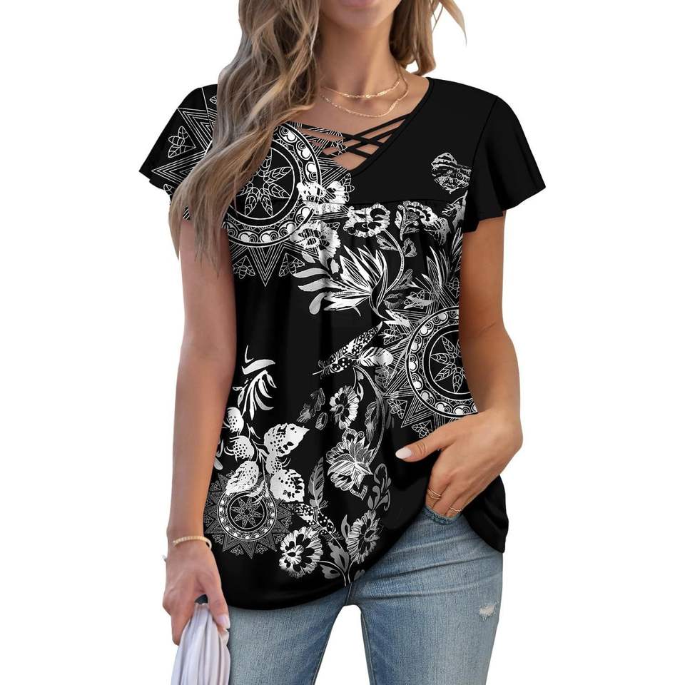 2025เสื้อทูนิคคอวีแขนสั้นสำหรับผู้หญิงใส่ในฤดูร้อนเสื้อสีดำและสีขาวไซส์ M"