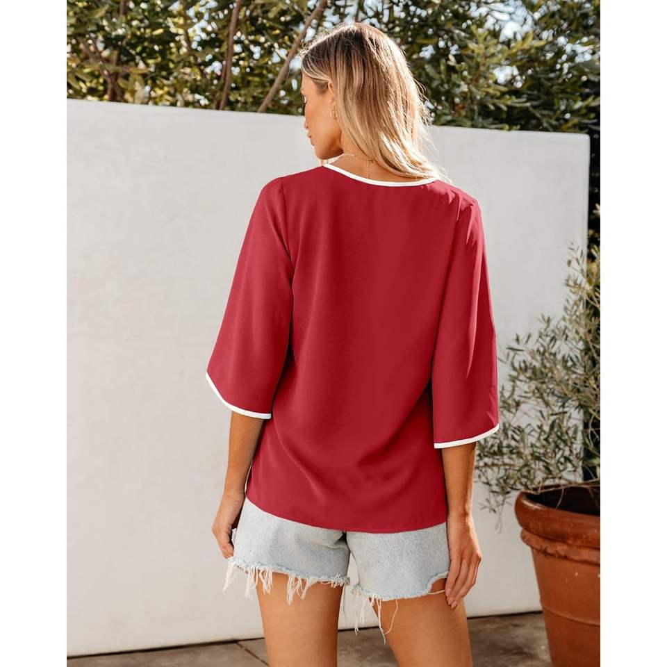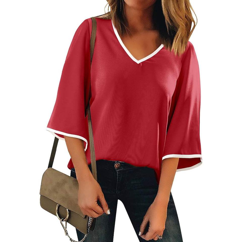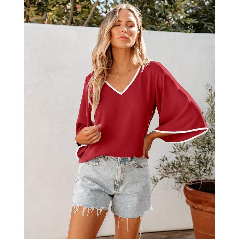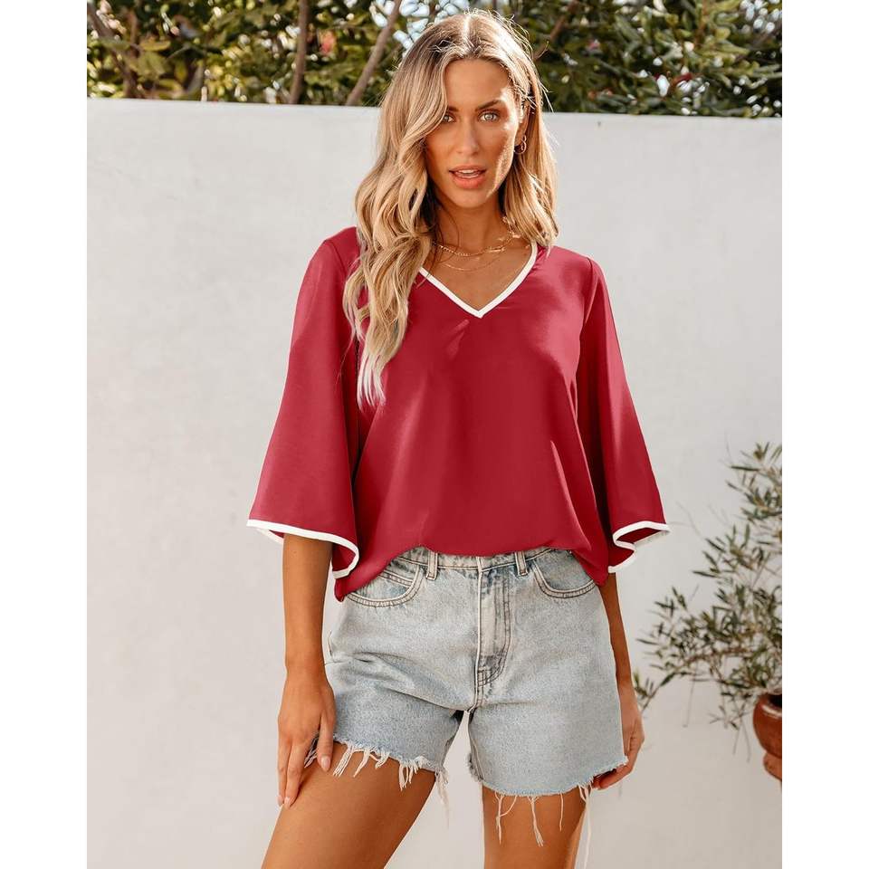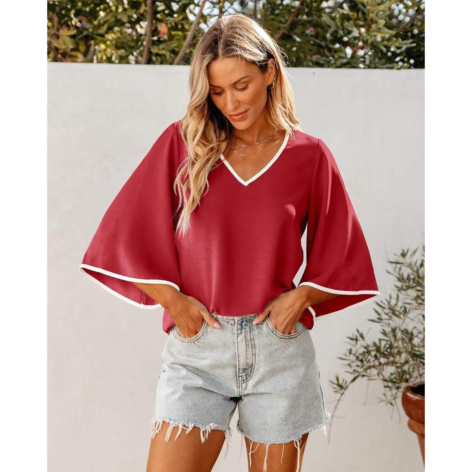 เสื้ออินเทรนด์ของผู้หญิง2025ยาว3/4ๆแขนกระดิ่งสีบล็อกไหลลื่นเสื้อทำงานลำลองธุรกิจสไตล์เกาหลี