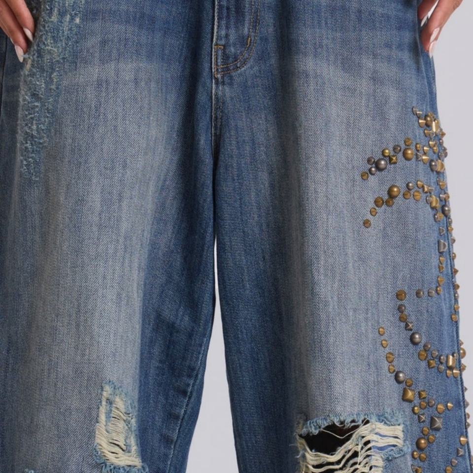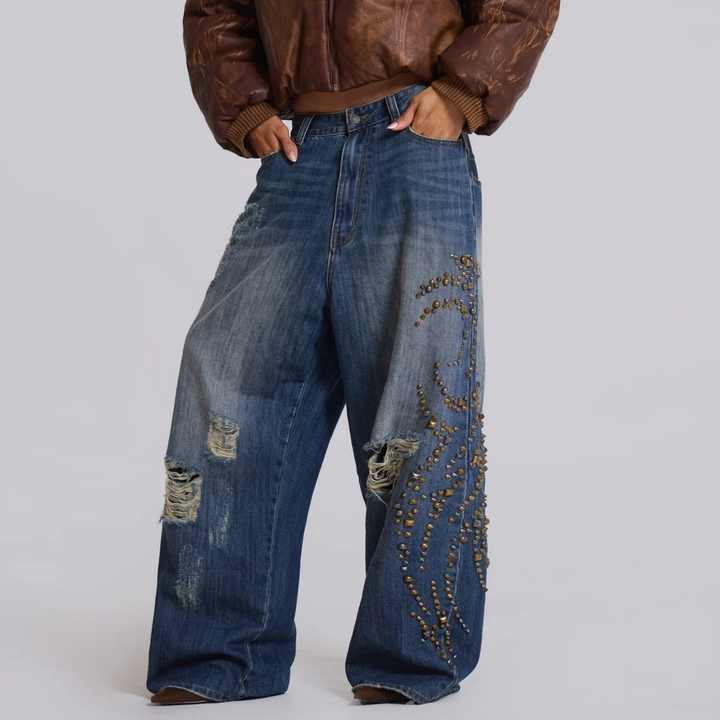 กางเกงยีนส์เดนิมวินเทจประดับเพชรสำหรับผู้หญิง ปี 2025 กางเกงยีนส์ทรงหลวมประดับเพชรสำหรับสุภาพสตรี
